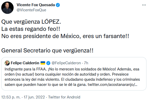 El exmandatario Vicente Fox se unió a la crítica que hizo su sucesor Felipe Calderón, a quien le indignó la orden dada a las Fuerzas Armadas de "no actuar" contra los criminales, además que envió un mensaje al Presidente Andrés Manuel López Obrador y al general Luis Cresencio Sandoval.Felipe Calderón lamentó la orden dada a los militares de "no actuar" contra los criminales y a través de sus redes sociales reaccionó a un video que el expresidente nacional del PRD, Guadalupe Acosta Naranjo, compartió y en el que se observa a elementos de las Fuerzas Armadas confrontados por civiles que golpean los vehículos militares."¡No lo merecen los soldados de México! Además, esa orden (no actuar) borra cualquier noción de autoridad y orden. Prevalece entonces la ley del más violento. El ciudadano queda indefenso y los criminales saben que pueden hacer lo que se le dé la gana", expresó Felipe Calderón.Al respecto, el expresidente Vicente Fox mandó un mensaje a López Obrador por su estrategia de seguridad: "Que vergüenza LÓPEZ. La estas regando feo!!"."No eres presidente de México, eres un farsante!!", agregó Fox.Y al retomar los dichos de Felipe Calderón, Vicente Fox también aprovechó para mandar un mensaje a Luis Cresencio Sandoval, titular de la Secretaría de la Defensa Nacional: "General Secretario qué vergüenza!!".OA