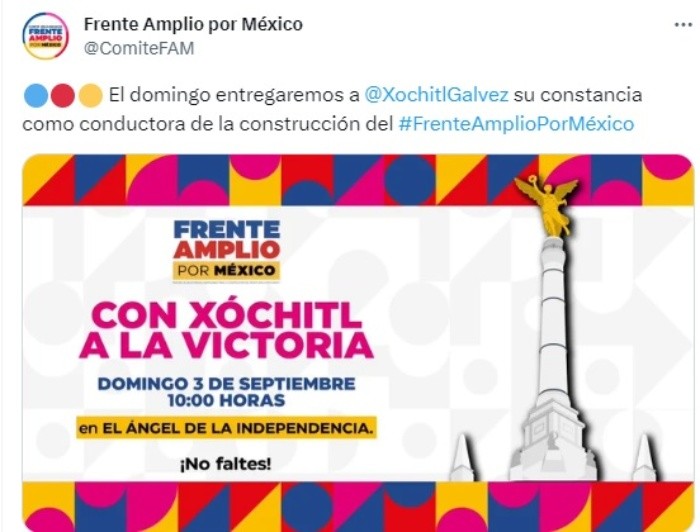 El pasado miércoles 30 de agosto, el presidente del Partido Revolucionario Institucional (PRI), Alejandro Moreno, anunció que Xóchitl Gálvez será quien buscará la presidencia por parte del partido Frente Amplio por México, coalición formada por el PRI, PAN y PRD, bajando de la contienda a la senadora Beatriz Paredes. El partido Frente Amplio tenía planeado llevar a cabo este próximo domingo 3 de septiembre la consulta ciudadana para elegir a la candidata, tal y como se tenía previsto desde un principio, pues el 50% serían los resultados de las encuestas y el restante sobre el ejercicio ciudadano.La senadora del PAN obtuvo fue ganadora en las encuestas del Frente Amplio por México con un resultado de 57.58%, contra el 42.42% registrado para Beatriz.Ahora la incertidumbre es aún mayor, ya que a pesar de que se informara que Xóchitl Gálvez será quien busque la presidencia en 2024 por el Amplio México, no se sabe si se llevará a cabo la consulta ciudadana. Se rumora que dicho ejercicio será cancelado a pesar de lo anunciado el miércoles pasado, sin embargo, esto aún no es oficial, pues en las redes sociales del partido Va por México continúa una publicación invitando a las personas a acudir a la consulta. Para la consulta del próximo domingo se esperaba tener una participación de más de 2 millones 297 mil personas, aunque tendremos que esperar un anunció del comité organizador sobre qué pasará.MF