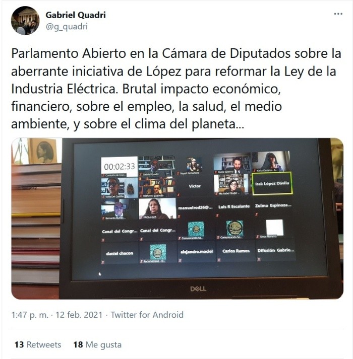 El excandidato presidencial de Nueva Alianza en el 2012, Gabriel Quadri, arremetió contra la reforma preferente del Presidente Andrés Manuel López Obrador (AMLO) para modificar la Ley de la Industria Eléctrica y opinó que esta iniciativa no tiene ninguna lógica, ni racionalidad pública. "Es un capricho y obedece a un fundamentalismo ideológico, ignorancia, incompetencia e ineptitud", afirmó.Al participar en el segundo día del parlamento abierto en la Cámara de Diputados para analizar esta propuesta presidencial, Quadri dijo que, con este proyecto, AMLO quiere volver a un pasado ya inalcanzable de energías del siglo XIX. "Estamos ante una iniciativa que no tiene en ninguna lógica, ninguna racionalidad pública, obedece más bien a un capricho, que obedece a un fundamentalismo ideológico, a ignorancia, a incompetencia, o ineptitud y a un afán de volver a un pasado ya inalcanzable y de volver a las energías del siglo XIX", dijo.En este contexto, el también economista y ambientalista dijo que este proyecto tiene un carácter pernicioso, regresivo, retardatario y agregó que es un atentado contra los principios de legalidad, contra la Constitución, contra el derecho humano a la salud, contra el derecho humano a un medio ambiente sano, contra principios básicos de competencia y libre concurrencia."Va a tener impactos muy severos sobre la economía nacional ahuyentando la inversión privada, generando un ambiente de incertidumbre jurídica, de incertidumbre política en nuestro país que va a impactar sobre la retirada de la inversión extranjera en México", dijo Quadri.Además, proyecta que la iniciativa traerá demandas, amparos, pérdida de empleos y controversias por parte del gobierno de Estados Unidos por la violación de los términos en el Tratado de Estados Unidos y Canadá, así como sanciones comerciales y aranceles por ajuste de carbono.Consideró que esta iniciativa, además de ser una aberración económica, energética, social y financiera, es un atentado contra la salud pública, así como un atentado directo en contra del artículo cuarto constitucional que establece el derecho a un medio ambiente sano y el derecho a la salud.JM