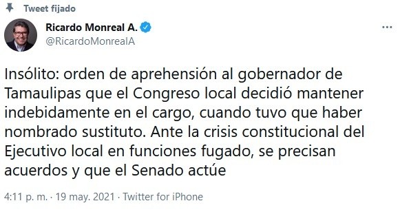 Ricardo Monreal, senador de Morena, afirmó hoy que se giró una orden de aprehensión contra el gobernador de Tamaulipas, Francisco García Cabeza de Vaca, aunque el Gobierno federal no lo ha confirmado y a pesar de que persisten dudas sobre su desafuero."Insólito: orden de aprehensión al gobernador de Tamaulipas que el Congreso local decidió mantener indebidamente en el cargo, cuando tuvo que haber nombrado sustituto" dijo Monreal a través de su cuenta de Twitter."Ante la crisis constitucional del Ejecutivo local en funciones fugado, se precisan acuerdos y que el Senado actúe".La Fiscalía General de la República (FGR) que acusa a García Cabeza de Vaca de corrupción, nexos con el crimen organizado y defraudación fiscal,no ha emitido información oficial respecto a la orden de captura en su contra.La Unidad de Inteligencia Financiera (UIF) anunció esta tarde que congeló las cuentas de la red ligada al gobernador García Cabeza de Vaca."He ordenado el congelamiento de cuentas de la red de Francisco G por presuntas operaciones con recursos de procedencia ilícita. 12 personas físicas y 25 jurídicas. Cero tolerancia a la corrupción y a la impunidad, sobre todo a quienes se creían intocables", informó en Twitter Santiago Nieto, titular de la UIF.La UIF, organismo de la Secretaría de Hacienda federal, ya había realizado una investigación contra el gobernador de Tamaulipas por defraudación fiscal equivalente a 6.5 millones de pesos y una supuesta compraventa ilegal de unas casas en Estados Unidos.El caso de García Cabeza de Vaca provocó un enfrentamiento entre la Cámara de Diputados, que le retiró el fuero para permitir que sea procesado, y el Congreso de Tamaulipas, que aprobó mantener la inmunidad al gobernador.Desde el pasado 30 de abril, la Cámara de Diputados había aprobado la solicitud de la FGR de desaforar a García Cabeza de Vaca por los delitos de delincuencia organizada, operación de recursos con procedencia ilícita y fraude fiscal.La Suprema Corte Justicia de la Nación (SCJN) desechó el pasado 14 de mayo un recurso de inconstitucionalidad presentado por la cámara tamaulipeca, pero no aclaró la situación del gobernador.Con información de EFEIM