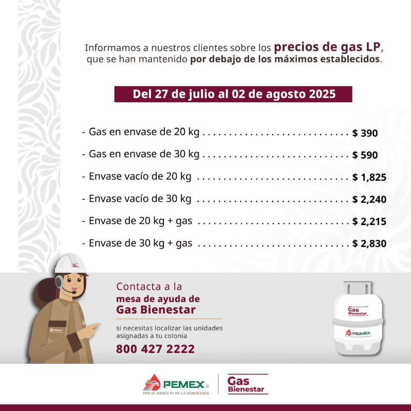 El Gobierno de México, con el objetivo de garantizar precios justos en la distribución de gas LP, ha puesto en marcha el programa Gas Bienestar, gestionado por Petróleos Mexicanos. Este programa está actualmente en funcionamiento en la Ciudad de México, donde, a través de su cuenta oficial en X (antes conocido como Twitter), Gas Bienestar ha publicado los precios que estarán vigentes del 29 de julio al 02 de agosto.Estos precios, orientados a apoyar la economía familiar y evitar aumentos no justificados, reflejan el compromiso de proporcionar un energético esencial a costos accesibles dentro de los límites establecidos por la Comisión Nacional de Energía.Estos precios se mantienen dentro de los topes máximos establecidos por las autoridades regulatorias, como parte de la estrategia de Gas Bienestar para ofrecer un servicio de calidad con cilindros supervisados y sellos de garantía que aseguren el 100% del contenido.Solicitar el suministro de Gas Bienestar es un proceso sencillo y accesible. A través de su cuenta de X, este programa informó que la única manera de solicitar la venta de cilindros es por pedido.La empresa, que opera con camiones equipados con tecnología avanzada para garantizar seguridad y localización, invita a los consumidores a contactar al centro de ayuda al número 800 427 2222 para cualquier consulta o servicio.YC