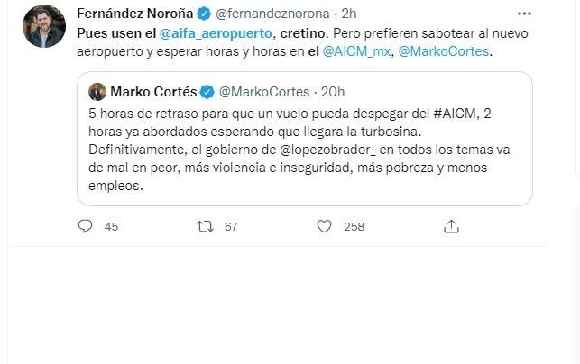 El diputado del Partido del Trabajo, Gerardo Fernández Noroña, recomendó al líder nacional del PAN, Marko Cortés Mendoza, usar el nuevo Aeropuerto Internacional Felipe Ángeles (AIFA), luego de que el panista se quejara del retraso de su vuelo en la terminal aérea de la Ciudad de México.Todo inició, cuando Cortés Mendoza externó que su vuelo llevaba cinco horas de retraso en el Aeropueto Internacional de la Ciudad de México y culpó a la administración federal de ello."5 horas de retraso para que un vuelo pueda despegar del #AICM, 2 horas ya abordados esperando que llegara la turbosina. Definitivamente, el gobierno de López Obrador en todos los temas va de mal en peor, más violencia e inseguridad, más pobreza y menos empleos", escribió el líder blanquiazul en su cuenta personal de Twitter.A lo que, el petista le sugirió que usara el AIFA, en vez de estarlo saboteando y estar esperarando horas y horas en el AICM. "Pues usen el @aifa_aeropuerto, cretino. Pero prefieren sabotear al nuevo aeropuerto y esperar horas y horas en el @AICM_mx, @MarkoCortes", divulgó el político.No es la primera vez que Noroña recomienda usar el AIFA. El pasado 30 de mayo, el diputado se quejó a través de redes sociales de los retrasos de los vuelos en el Aeropuerto Internacional de la Ciudad de México (AICM).El funcionario regresaba de Puerto Escondido a la Ciudad de México y su vuelo presentaba ya cuatro horas de retraso, puesto que tenía que aterrizar en el AICM. Por lo anterior, a través de su cuenta de Twitter, sugirió que las aerolíneas deben ampliar sus vuelos desde el Aeropuerto Internacional Felipe Ángeles (AIFA) para evitar siga empeorando el servicio en el AICM.CF
