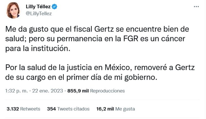 Ante el estado de salud de Alejandro Gertz Manero, titular de la Fiscalía General de la República (FGR), la senadora Lilly Téllez deseó que se encuentre bien y le envió un mensaje como aspirante a la Presidencia de México en 2024.A través de redes sociales, la senadora del PAN declaró que la permanencia de Gertz Manero en la FGR "es un cáncer para la institución"."Por la salud de la justicia en México, removeré a Gertz de su cargo en el primer día de mi gobierno", escribió la legisladora de Acción Nacional.De acuerdo con el Presidente Andrés Manuel López Obrador, el fiscal Gertz Manero "está muy bien" y "está haciendo su trabajo".En su conferencia mañanera del pasado 20 de enero, López Obrador informó sobre la salud del fiscal: "Está muy bien Alejandro Gertz Manero, está haciendo su trabajo. Pues como todos, necesitamos a veces de alguna reparación, ¿no?, pero está muy bien. Y es una buena persona, un buen servidor público y está trabajando", declaró.JM