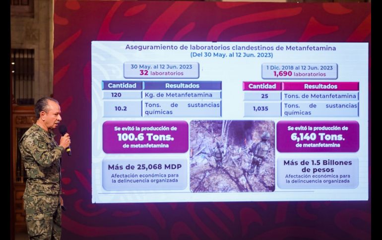 En el marco del combate al tráfico de fentanilo, el almirante José Rafael Ojeda Durán, titular de la Secretaría de Marina (Semar), informó que en los casi cinco años de gobierno del Presidente Andrés Manuel López Obrador se han decomisado 7.5 mil kilogramos de esta sustancia.En el informe semanal del gabinete de seguridad, el almirante secretario detalló que en lo que va del mes de junio se han decomisado tres kilogramos y mil 726 en este 2023.Frente al Presidente López Obrador, el titular de la Marina detalló que, en cuanto a metanfetaminas, suman 129 kilogramos este mes y en lo que va el año 134 mil, mientras que desde el 1 de diciembre de 2018 suman 291 mil kilogramos."En el mes de junio, (se ha decomisado) fentanilo tres kilogramos, mil 726 kilogramos en el año y en total siete mil 564 kilogramos. Metanfetaminas: 129 kilogramos en este mes, en lo que va el año 134 mil y en lo que va del sexenio 291 mil kilogramos", informó. JM
