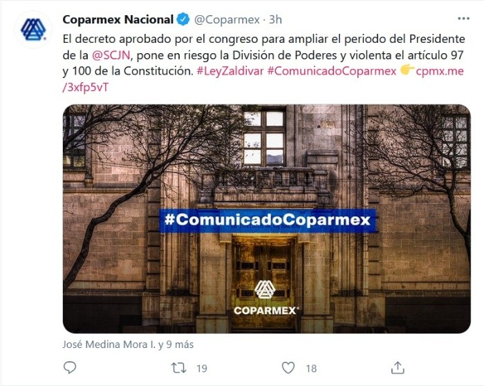 Es contundentemente inconstitucional y grave la minuta de la Ley Orgánica del Poder Judicial que aprobó el Congreso por el que se extiende por dos años el periodo del presidente de la Suprema Corte de Justicia de la Nación, Arturo Zaldívar, declaró la Confederación Patronal de la República Mexicana (Coparmex).Tras aprobarse la ampliación del mandato en la Cámara de Diputados, la Confederación afirmó que se vulnera la división de Poderes y se violentan los artículos constitucionales 97 y 100, porque no se pueden ampliar los plazos de los cargos cuando la propia Constitución establece expresamente los tiempos."Es una gravísima y contundente inconstitucionalidad en la propuesta de adición, poniendo en riesgo la autonomía de Poderes, ya que en el mismo sentido el artículo 100, párrafo quinto de la Constitución, precisa tácitamente que la duración del presidente del Consejo es de cuatro años", explicó.Además de ir contra lo establecido en la Carta Magna, se "mina la división e independencia de los Poderes en nuestro país", lo que resulta grave, agregó. Para la Coparmex, la aprobación en el Congreso "atenta contra la división de poderes, pues no se debe, mediante argucias inconstitucionales e ilegales, ampliar el período de desempeño de los cargos a los que la propia Carta Magna les señala, ex profeso, una duración específica".El sindicato patronal que dirige José Medina Mora expresó que se pronuncian "por el respeto al Estado de Derecho y a la Constitución de nuestro País, que es fundamental para el desarrollo económico, social y político de una democracia".JM