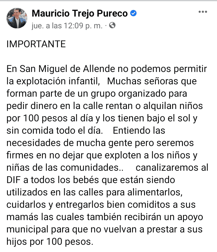 El alcalde de San Miguel de Allende, Guanajuato, Mauricio Trejo Pureco, señaló que un grupo organizado de señoras renta o alquila niños por la cantidad de 100 pesos al día para lucrar con ellos en los espacios públicos."A niños y niñas los tienen bajo el sol y sin comida todo el día", describió.En sus redes sociales, el edil advirtió que en San Miguel de Allende no permitirán la explotación infantil, y esos menores serán canalizados al Sistema para el Desarrollo Integral de la Familia."Entiendo las necesidades de mucha gente, pero seremos firmes en no dejar que exploten a los niños y niñas de las comunidades", dijo.Mencionó que enviaran al DIF a todos los bebés que están siendo utilizados en las calles, para alimentarlos, cuidarlos y entregarlos bien comiditos a sus mamás".A las madres de esos infantes la Presidencia Municipal les entregará un apoyo municipal para que no vuelvan a prestar a sus hijos por 100 pesos, anunció.En enero pasado, tres mujeres fueron detenidas en Celaya y vinculadas a proceso penal por el delito de Corrupción de Menores por enviar a cinco niños, a veces sin zapatos, con carencia de ropa y sucios, a pedir dinero en una vialidad.OF
