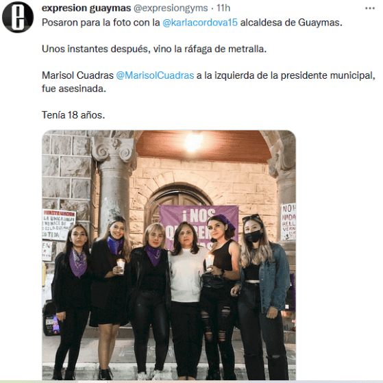 La noche de ayer jueves, Marisol Cuadras, una activista de 18 años, fue asesinada a balazos por hombres armados mientras se manifestaba afuera del Palacio Nacional de Guaymas, en el estado de Sonora por el Día Internacional de eliminación de la Violencia contra la Mujer.A corta edad, Marisol buscaba hacer un cambio y por eso se unió al colectivo feminista Feministas del Mar, con el cual organizó múltiples manifestaciones para hacer un llamado a las autoridades y parar la violencia contra la mujer.En sus redes sociales solía compartir imágenes y mensajes sobre el feminismo y su constante lucha contra la desaparición de mujeres. Y justamente días antes del 25 noviembre, Marisol y otras mujeres compartieron el flyer donde convocaban a la manifestación, que sin saberlo, resultaría fatídica.Marisol estudiaba en el Centro de Estudios Tecnológicos del Mar Guaymas, quienes lamentaron el asesinato de la joven y exigieron que no haya más violencia en dicho municipio. Además, ella misma compartía en redes que trabajaba todos los días de la semana y todavía se daba tiempo para ir al gimnasio. En redes sociales se han compartido varias imágenes donde se ve a Marisol afuera del Palacio Municipal, donde está con otras compañeras del colectivo e incluso con la alcaldesa de Guaymas, Karla Cordova, quien esperó hasta la mañana de hoy viernes para ofrecer un mensaje sobre el ataque.Ayer por la noche, un grupo de sicarios llegó al Palacio Municipal de Guaymas para enfrentarse a tiros con los guardaespaldas de la alcaldesa, lo que provocó la muerte de tres personas y dos heridos.GC