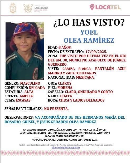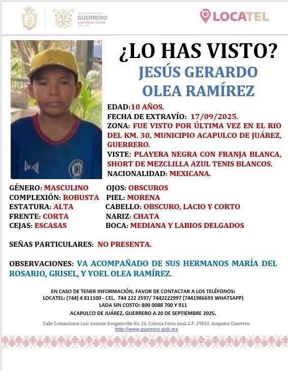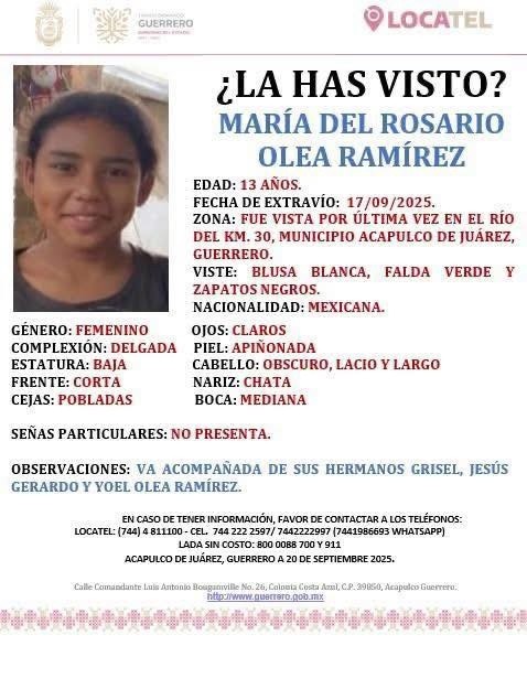 En Acapulco, Guerrero, se ha denunciado la desapreció de cuatro menores de edad que son hermanos. Todo en una zona de alta actividad del crimen organizado.Cuatro menores de edad, todos hermanos, fueron desaparecidos en el poblado El 30, en la zona rural de Acapulco.De acuerdo con fichas de búsqueda de Locatel, los cuatro hermanados fueron vistos por última vez el 17 de septiembre cuando estaban bañándose en el río del poblado El 30.A cuatro días de la desaparición de los menores, ninguna autoridad ha informado si hay operaciones de búsqueda. Incluso, del caso se supo la noche del sábado 20 de septiembre a través de las redes sociales, cuando Locatel difundió las fichas de búsqueda.Los cuatro menores fueron identificados como María del Rosario de 13 años; Grisel de 12; Jesús Gerardo de 10 y Yoel Olea Ramírez de 8 años.De acuerdo con las fichas de búsqueda de Locatel, María del Rosario vestía una blusa blanca, falda verde y zapatos negros; Grisel también vestía una blusa blanca y una falda verde; Jesús portaba una playera negra con franja blanca, short de mezclilla y tenis blancos, mientras que Yoel camisa blanca, pantalón azul y zapatos negros.El 19 de mayo, un comando armado realizó un ataque contra el poblado de El 30, donde murieron seis personas y tres más quedaron heridas.El 30 es el bastión de una de las organizaciones criminales más antiguas que operan en Acapulco, la familia Arismendi que mantiene un control férreo sobre ese poblado y las comunidades vecinas. * * * Mantente al día con las noticias, únete a nuestro canal de WhatsApp * * *OA