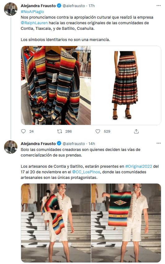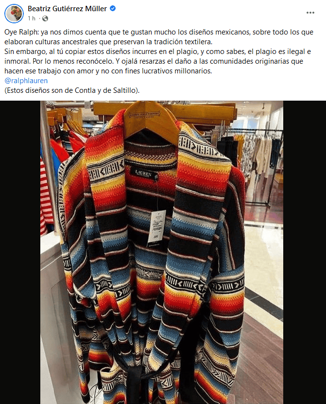 La doctora Beatriz Gutiérrez Müller denunció a través de redes sociales plagio de la marca Ralph Lauren al diseño del sarape de Contla, Tlaxcala, y Saltillo, Coahuila.La esposa del Presidente Andrés Manuel López Obrador señaló que la marca de ropa estadounidense copió los diseños y "el plagio es ilegal e inmoral"."Oye Ralph: ya nos dimos cuenta que te gustan mucho los diseños mexicanos, sobre todo los que elaboran culturas ancestrales que preservan la tradición textilera"."Sin embargo, al tú copiar estos diseños incurres en el plagio, y como sabes, el plagio es ilegal e inmoral. Por lo menos reconócelo", expresó la también escritora.En su mensaje, Beatriz Gutiérrez Müller pidió a Ralph resarcir el daño a las comunidades originarias "que hacen ese trabajo con amor y no con fines lucrativos millonarios".Alejandra Frausto, secretaria de Cultura, también se pronunció en contra de la apropiación cultural que realizó Ralph Lauren hacia las creaciones originales de las comunidades de Contla y Saltillo."Los símbolos identitarios no son una mercancía", expresó Frausto en redes sociales al compartir imágenes de plagio en el diseño.OA