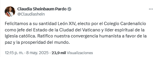 Este jueves 8 de mayo, la Presidenta de México, Claudia Sheinbaum, reaccionó a la elección de Robert Francis Prevost como nuevo líder de la Iglesia Católica, y que será conocido como Papa León XIV entre los fieles.La Mandataria publicó un mensaje en sus redes sociales: "Felicitamos a su santidad León XIV, electo por el Colegio Cardenalicio como jefe del Estado de la Ciudad del Vaticano y líder espiritual de la Iglesia católica. Ratifico nuestra convergencia humanista a favor de la paz y la prosperidad del mundo".Robert Francis Prevost, el Papa León XIV, será el primer papa estadounidense de la historia de la iglesia católica, el segundo procedente del continente americano y el cuarto no italiano en los últimos 48 años. Anteriormente, cardenal, el ahora Papa León XIV nació en Chicago, Illinois, el 14 de septiembre de 1955 y también cuenta con ciudadanía de Perú, donde fue misionero y obispo de Chiclayo. Además, será el segundo procedente del continente americano, después de su antecesor, el argentino Francisco (Jorge Mario Bergoglio, 2013-2025), quien fue primer latinoamericano de la historia. *Mantente al día con las noticias, únete a nuestro canal de WhatsAppOF