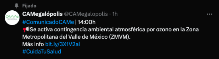 La Comisión Ambiental de la Megalópolis informó que se activó la Fase 1 de contingencia ambiental, en la Zona Metropolitana del Valle de México (ZMVM), debido a que este sábado 25 de mayo se registró una concentración máxima de ozono de 174 ppb en la estación UAM Xochimilco (UAX), ubicada en la Alcaldía Xochimilco en la capital del país. La dependencia detalló que el sistema de alta presión que ayer se debilitó y que permitió la desactivación de la contingencia ambiental, se ha fortalecido en el transcurso del día de hoy.Además, se han registrado temperaturas superiores a los 30°C e intensa radiación solar sobre el Valle de México, por lo que se alcanzó concentraciones de Muy Mala calidad del aire.Por lo anterior la CAMe informó que para mañana, domingo 26 de mayo aplicará el programa Doble Hoy No Circula, en horario de las 5:00 a las 22:00 horas en la Ciudad de México y Estado de México. NA