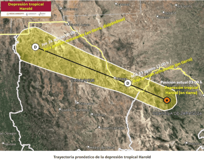 El Servicio Meteorológico Nacional (SMN), fuente oficial del Gobierno de México en materia climática, ha dado seguimiento a "Harold" y su impacto en el territorio nacional.El SMN informó que el centro de la depresión tropical "Harold" se desplaza sobre el norte de Coahuila y mantiene condiciones para lluvias fuertes a puntuales muy fuertes, así como rachas fuertes de viento en estados del norte y noreste del país. Se mantiene en vigilancia.En su distancia al lugar más cercano, el sistema se encuentra a 140 km al suroeste de Ciudad Acuña, Coahuila, y a 245 km al este-sureste de Ojinaga, Chihuahua.Además, su desplazamiento actual es hacia el oeste-noroeste (300°) a 22 km/h y mantiene vientos máximos sostenidos de 45 km/h y rachas 65 km/h.Se prevén lluvias puntuales muy fuertes en Chihuahua y fuertes en Coahuila, Nuevo León y Tamaulipas.El pronóstico señala que este mismo miércoles, "Harold" será baja presión remanente, cuando esté en tierra, a 65 km al este-sureste de Ojinaga, Chihuahua.Autoridades pidieron extremar precauciones a la población en general en las zonas de los estados mencionados por lluvias y viento; así como atender las recomendaciones emitidas por las autoridades del Sistema Nacional de Protección Civil, en cada entidad.Con información del Servicio Meteorológico Nacional OA