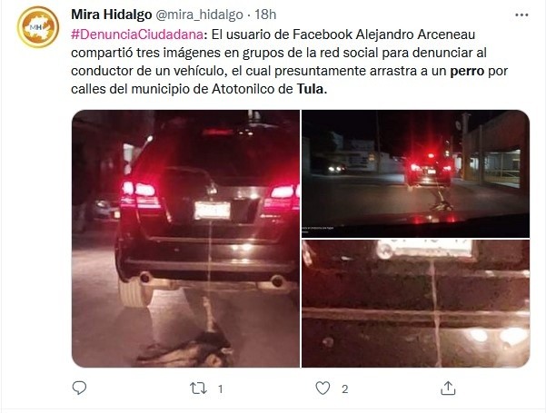 En 14 días, Hidalgo registró la tercera denuncia pública de maltrato animal; en esta ocasión, el hecho se registró en la comunidad de Las Bóvedas, municipio de Atotonilco de Tula, donde se documentó y difundió en redes sociales una camioneta en movimiento que arrastraba a un perro.Las fotografías mostraban una camioneta oscura que lleva atado un perro y lo arrastra por la calle. La organización animalista La Jauria de Balú acusó que esta agresión fue reportada al número 089, donde les respondieron que no podían hacer nada.El organismo señaló que existe preocupación por el incremento de maltrato animal en todas las especies y en un estado donde precisan que las leyes son discriminatorias. La Jauria de Balú exigió que la alcaldía atienda este caso.Por su parte, la alcaldía informó que recibieron el reporte del C4, por lo cual una unidad de la Policía Municipal acudió a atender la denuncia.Se conoció por las cámaras de seguridad que la camioneta Journey color negra se dirigía a la comunidad de Tlamaco, en el municipio de Atitalaquia. Aseguran que se trabaja en coordinación con las autoridades estatales para ubicar al vehículo y al responsable de este delito.El día 10 se difundió el maltrato que sufrió un burro, a quien también ataron a una camioneta y arrastraron, mientras que el pasado fin de semana se documentó el maltrato a un perro por personal de la alcaldía de Chapulhuacan.JM