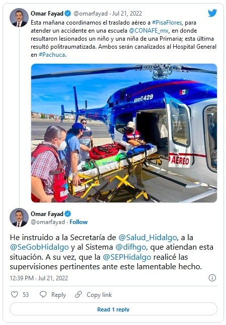 Dos niños de seis años de edad resultaron gravemente lesionados al caer una barda en un salón de clases de la escuela primaria Aquiles Serdán, que depende del Consejo Nacional de Fomento Educativo (Conafe), en el municipio de Pisaflores, Hidalgo.De acuerdo con los primeros reportes, alrededor de las 09:20 horas se registró el incidente, al caerse una barda de aproximadamente tres metros de largo por uno de alto, la cual aparentemente no se encontraba bien cimentada, lo que ocasionó que se derrumbara en los momentos en que los menores se encontraban en clases.El accidente se registró en la comunidad de La Escondida, en el municipio de Pisaflores en la Sierra de Hidalgo, por lo cual las autoridades solicitaron el apoyo del gobierno del Estado para poder prestar auxilio a dos niños que resultaron con fracturas en los pies.El gobernador, Omar Fayad, ordenó el traslado de elementos de emergencia y Protección Civil a esa demarcación, además de que se coordinaron con el secretario de salud, Efraín Benítez, para prestar el auxilio médico, ya que las fracturas requerían atención inmediata.Durante los primeros auxilios se diagnosticó que ambos menores, un niño y una niña, presentan politraumatismos en ambos pies, por lo cual luego de que fueron estabilizados los trasladaron al Hospital General de Pachuca a través de un puente aéreo.JM