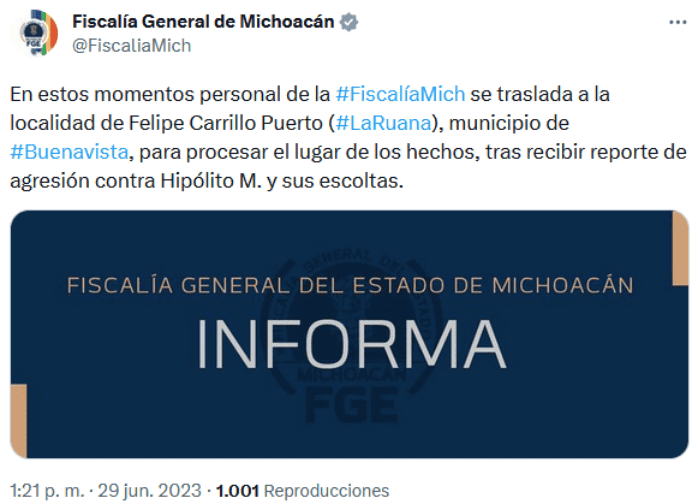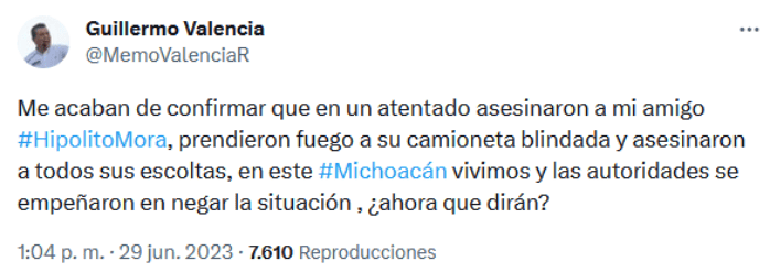 Hipólito Mora Chávez fue asesinado. Es el reporte de varios medios de comunicación que dieron a conocer el homicidio del exlíder de autodefensas en Michoacán.El exlíder de las autodefensas denunciaba con regularidad el abuso, extorsión y cobro de piso del crimen organizado a los habitantes de las localidades michoacanas.Tras la noticia, la fiscalía de Michoacán informó que personal de la dependencia se trasladó a la localidad "para procesar el lugar de los hechos, tras recibir reporte de agresión contra Hipólito M. y sus escoltas", sin dar más detalles al respecto.Por su parte, Guillermo Valencia, presidente del Comité Directivo Estatal del PRI en Michoacán, confirmó el homicidio de Hipólito Mora con un mensaje en su cuenta de Twitter:"Me acaban de confirmar que en un atentado asesinaron a mi amigo #HipolitoMora, prendieron fuego a su camioneta blindada y asesinaron a todos sus escoltas, en este #Michoacán vivimos y las autoridades se empeñaron en negar la situación , ¿ahora que dirán?".Hipólito Mora vivía en Felipe Carrillo Puerto, La Ruana, una localidad de Michoacán, que forma parte del municipio de Buenavista, en la región de Tierra Caliente.Mora Chávez había dado a conocer su intensión de convertirse en gobernador de Michoacán.OA