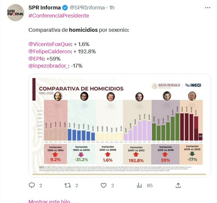 El número de homicidios dolosos en México subió un 0.26% interanual en el primer cuatrimestre de 2023 hasta los nueve mil 912 asesinatos, un promedio de 83 al día, según informó este martes la Secretaría de Seguridad y Protección Ciudadana (SSPC).Estas cifras se comparan con los nueve mil 886 homicidios de los primeros cuatro meses de 2022, según datos que exhibió la titular de la SSPC, Rosa Icela Rodríguez, en la conferencia matutina del Gobierno.Aún así, solo en abril, la SSPC documentó dos mil 428 asesinatos, una reducción interanual de 5.08% frente a los dos mil 558 del mismo mes de 2022, además de un decremento mensual de casi 6.8% ante los dos mil 605 de marzo pasado."En cuanto al homicidio doloso, respecto del inicio de la Administración (en diciembre del 2018), las cifras que en aquel momento estaban, al día de hoy tiene una reducción de 16.1%. Se trata del mes de abril más bajo de los últimos seis años", aseveró Rodríguez.Rodríguez expuso que seis estados concentran casi la mitad de los homicidios: Guanajuato, Estado de México, Baja California, Chihuahua, Jalisco y Michoacán, que en conjunto representaron cuatro mil 688 de estos crímenes.Los datos de la SSPC también expusieron una subida interanual de 2.87% en los delitos del fuero federal en el primer cuatrimestre, cuando hubo 25 mil 854.La secretaria de Seguridad enunció, para el primer cuatrimestre, crecimientos interanuales de 6.6% en delitos relacionados con armas de fuego y explosivos, y de 6.5% en los delitos fiscales.Pero señaló decrementos de 35.4% en los crímenes de delincuencia organizada, de 30.3% en delitos financieros, y de 22.4% en los cometidos por servidores públicos.Por otro lado, en delitos del fuero común, el robo a transportista se elevó un 9% anual en el primer cuatrimestre.En cambio, hubo reducciones en el resto: de 15.9% en robo de transporte individual, de 13.9% en robo a transporte público, de 10.8% en robo a negocio y 7.8% en robo a transeúnte."En la mayoría de los delitos del fuero común hubo reducciones importantes, vamos a seguir trabajando en las mesas de paz para seguir reduciendo estos delitos", presumió Rodríguez.En cuanto a feminicidios, asesinatos de mujeres por razones de género, la SSPC registró 60 en abril pasado, una caída de casi 32% ante el mismo mes de 2023.En lo que va del año, ha habido 288 feminicidios, un 13.25% menos que los 332 del mismo periodo de 2022."En el feminicidio también hubo una reducción, vamos a seguir trabajando con el Instituto de Mujeres, con Conavim (Comisión Nacional para Prevenir y Erradicar la Violencia Contra las Mujeres), con todos los compañeros, compañeras, que trabajan la violencia feminicida para seguir reduciendo este delito", indicó Rodríguez.Estas cifras se reportan tras la caída anual de 7.1% en homicidios en 2022, cuando México tuvo 30 mil 968 asesinatos tras los dos años más violentos de su historia.JM