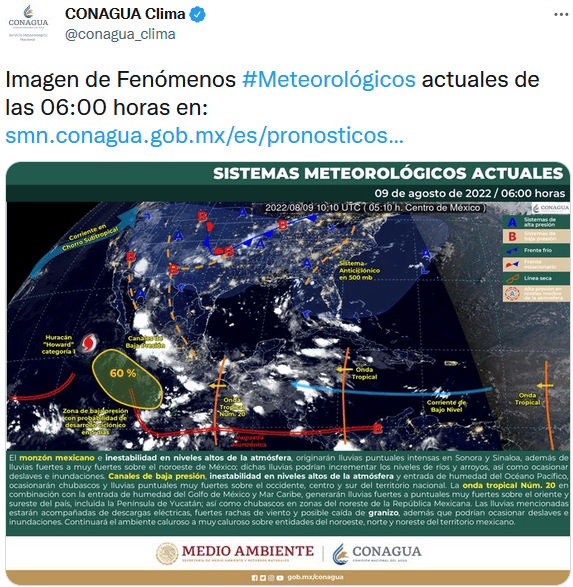 El Servicio Meteorológico Nacional (SMN), dependiente de la Comisión Nacional del Agua (Conagua), informó que este martes será lluvioso para la mayor parte del país, debido a diferentes fenómenos meteorológicos, incluido el huracán categoría "Howard".Este martes, el monzón mexicano persistirá sobre el noroeste de México y junto con inestabilidad en niveles altos de la atmósfera, originarán lluvias puntuales intensas en Sonora y Sinaloa, además de lluvias fuertes a muy fuertes en la región mencionada; dichas lluvias podrían incrementar los niveles de ríos y arroyos, así como ocasionar deslaves e inundaciones.Canales de baja presión, sobre el occidente, centro y sur del territorio nacional, inestabilidad en niveles altos de la atmósfera y entrada de humedad del Océano Pacífico, ocasionarán chubascos y lluvias puntuales muy fuertes en dichas regiones.La onda tropical Núm. 20 se desplazará sobre el sureste, centro y sur de la República Mexicana y en combinación con la entrada de humedad del Golfo de México y Mar Caribe, generarán lluvias fuertes a puntuales muy fuertes sobre el oriente y sureste del país, incluida la Península de Yucatán; así como chubascos en zonas del noreste.Las lluvias mencionadas estarán acompañadas de descargas eléctricas, fuertes rachas de viento y posible caída de granizo, además que podrían ocasionar deslaves e inundaciones. Continuará el ambiente caluroso a muy caluroso sobre entidades del noroeste, norte y noreste del territorio mexicano, pudiendo superar los 40 °C en Baja California, Sonora, Coahuila, Nuevo León y Tamaulipas.Ayer lunes, "Howard" se convirtió en huracán categoría 1, en la que se prevé que continúe hoy martes.Aunque el fenómeno se aleja paulatinamente de las costas mexicanas, se pide extremar precauciones en las inmediaciones del sistema por lluvias, viento y oleaje a la navegación marítima."Howard" se ubica a 600 km al oeste-suroeste de Cabo San Lázaro, Baja California Sur.OA