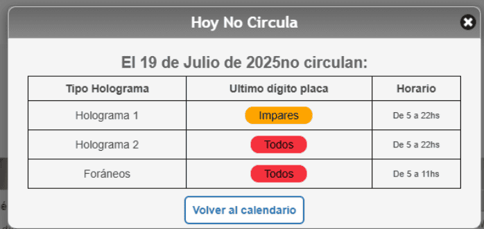 El programa Hoy No Circula Sabatino limita la circulación de los autos en función del último dígito de la placa y el color del engomado, con el objetivo de prevenir, minimizar y controlar la emisión de contaminantes a la atmósfera de la Zona Metropolitana del Valle de México. Recuerda que desde el pasado lunes 1 de julio el Hoy No Circula tiene modificaciones; pues entró en vigor en las zonas metropolitanas del Valle de Toluca y de Santiago Tianguistenco en el Estado de México, por ello aquí te explicamos todo lo que tienes que saber al respecto.Según el informe más reciente del Sistema de Monitoreo Atmosférico de la Ciudad de México (CDMX) con corte a las 16:00 horas, la calidad del aire en la capital del país y la zona conurbada es aceptable por lo que los niveles de contaminación no son lo suficientemente altos como para activar la contingencia ambiental.Por lo anterior el programa Hoy No Circula Sabatino aplica de forma normal el sábado 19 de julio del 2025 para los siguientes autos en la Ciudad de México (CDMX) y el Estado de México (Edomex). Al igual que durante la semana, los vehículos con holograma doble cero, cero, eléctricos e híbridos no están sujetos a restricciones en el programa.Recuerda que el horario del Hoy No Circula Sabatino es de las 5:00 de la mañana hasta las 10:00 de la noche, sin embargo, para los automóviles con placas foráneas, la restricción es más corta, de 5:00 a 11:00 horas.A partir del martes 1 de julio de 2025, el programa se amplió con la inclusión de nuevos municipios del Estado de México.NA