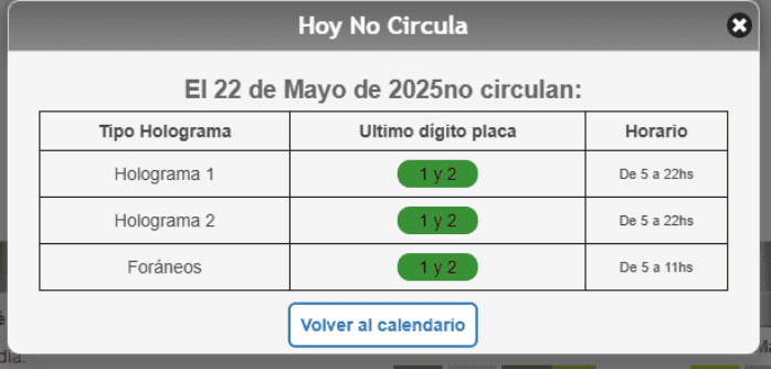 El programa Hoy No Circula limita la circulación de los autos en función del último dígito de la placa y el color del engomado, con el objetivo de prevenir, minimizar y controlar la emisión de contaminantes a la atmósfera de la Zona Metropolitana del Valle de México. Según el informe más reciente del Sistema de Monitoreo Atmosférico de la Ciudad de México (CDMX) con corte a las 18:00 horas, la calidad del aire en la capital del país y la zona conurbada es mala, por lo que existen condiciones para que se active la contingencia ambiental y el Doble Hoy No Circula para este jueves, por ello te recomendamos mantenerte pendiente de la información que proporcione la Comisión Ambiental de la Megalópolis (CAMe) en las próximas horas. Sin embargo, hasta la publicación de esta nota el programa Hoy No Circula aplica de forma habitual para el jueves 22 de mayo en la CDMX y el Edomex para lo siguientes autos: Mientras que los autos con los hologramas 00 y 0 están exentos de las limitaciones establecidas en el programa, así como los vehículos eléctricos e híbridos. Para que mañana puedas tomar tus precauciones, te recordamos que el horario del Hoy No Circula es desde las 5:00 de la mañana a las 10:00 de la noche, sin embargo, para los automóviles con placas foráneas, la restricción será de 5:00 a 11:00 horas.El Hoy No Circula aplica en las 16 alcaldías de la CDMX y en 18 municipios del Edomex:NA