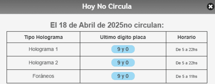 El programa Hoy No Circula limita la circulación de los autos en función del último dígito de la placa y el color del engomado, con el objetivo de prevenir, minimizar y controlar la emisión de contaminantes a la atmósfera de la Zona Metropolitana del Valle de México. Según el informe más reciente del Sistema de Monitoreo Atmosférico de la Ciudad de México (CDMX), con corte a las 16:00 horas, la calidad del aire en la capital del país y la zona conurbada es muy mala, lo cual indica un riesgo alto a la salud; se recomienda a la población evitar realizar actividades físicas vigorosas al aire libre. Sin embargo, hasta el corte de esta nota la Comisión Ambiental de la Megalópolis no ha activado la Contingencia Ambiental, por lo que el programa Doble Hoy No Circula no se encuentra vigente y continúa operando de forma habitual. Mientras que los autos con los hologramas 00 y 0 están exentos de las limitaciones establecidas en el programa, así como los vehículos eléctricos e híbridos. Para que mañana puedas tomar tus precauciones, te recordamos que el horario del Hoy No Circula es desde las 5:00 de la mañana a las 10:00 de la noche, sin embargo, para los automóviles con placas foráneas, la restricción será de 5:00 a 11:00 horas.El Hoy No Circula aplica en las 16 alcaldías de la CDMX y en 18 municipios de Edomex:Ciudad de MéxicoEstado de MéxicoSV