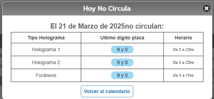 El programa Hoy No Circula limita la circulación de los autos en función del último dígito de la placa y el color del engomado, con el objetivo de prevenir, minimizar y controlar la emisión de contaminantes a la atmósfera de la Zona Metropolitana del Valle de México. Según el informe más reciente del Sistema de Monitoreo Atmosférico de la Ciudad de México (CDMX), con corte a las 18:00 horas, la calidad del aire en la capital del país y la zona conurbada es de aceptable a mala, lo cual indica un riesgo de moderado a alto, por lo que los niveles de ozono no son lo suficientemente altos como para activar el Doble Hoy No Circula.En ese sentido, para mañana viernes 21 de marzo del 2025 los siguientes autos descansan en la Ciudad de México (CDMX) y el Estado de México (Edomex): Mientras que los autos con los hologramas 00 y 0 están exentos de las limitaciones establecidas en el programa, así como los vehículos eléctricos e híbridos.Para que mañana puedas tomar tus precauciones, te recordamos que el horario del Hoy No Circula es desde las 5:00 de la mañana a las 10:00 de la noche, sin embargo, para los automóviles con placas foráneas, la restricción será de 5:00 a 11:00 horas.El Hoy No Circula aplica en las 16 alcaldías de la CDMX y en 18 municipios de Edomex:NA