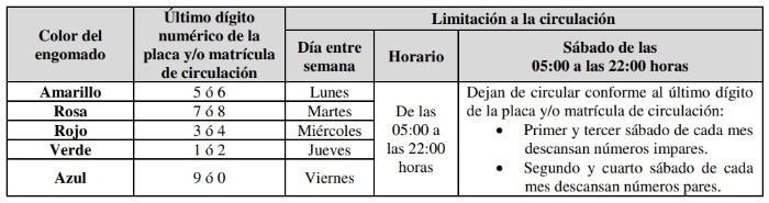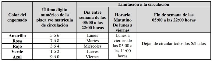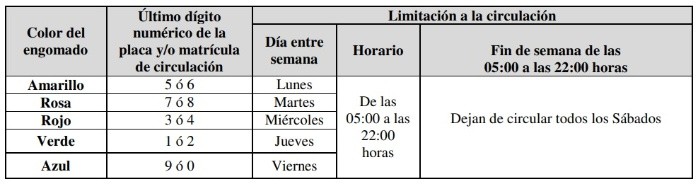 La circulación de los vehículos de uso particular, de carga, de transporte colectivo de pasajeros y taxis, que hayan obtenido en el proceso de verificación vehicular el holograma 1, se limita un día entre semana y dos sábados por cada mes, en un horario de las 05:00 a las 22:00 horas, con base en el último dígito numérico de la placa y/o matrícula de circulación y/o color de la calcomanía de circulación permanente (engomado), de conformidad con el siguiente calendario: