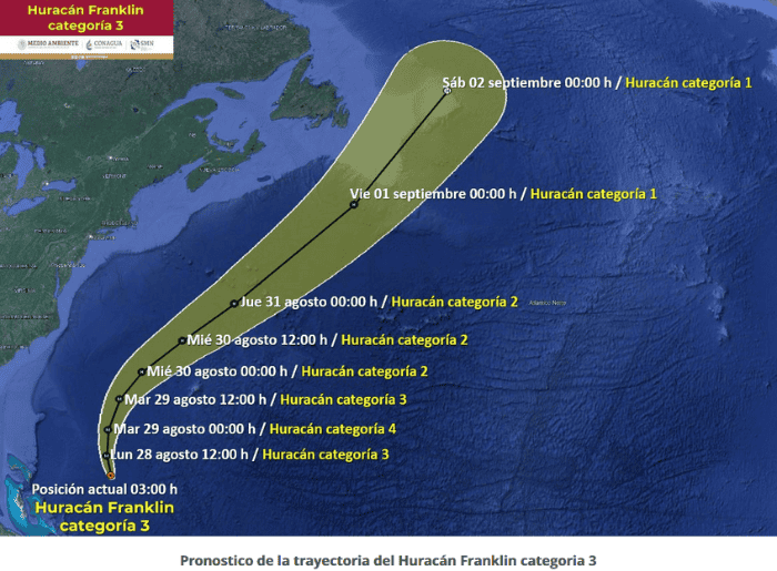 El Servicio Meteorológico Nacional (SMN), fuente oficial del Gobierno de México en materia climática, informó que "Franklin" ahora alcanzó la categoría 3 como huracán en la escala Saffir-Simpson, al norte de Isla Gran Turca, por lo que no representa peligro para el territorio mexicano. La distancia del huracán "Franklin" al lugar más cercano es a 635 km al norte de Isla Gran Turca y a mil 765 km al este-noreste de las costas de Quintana Roo. El desplazamiento actual del ciclón es hacia el nor-noroeste (335°) a 13 km/h y mantiene vientos máximos sostenidos de 185 km/h y rachas de 220 km/h.Debido a su distancia y trayectoria, el sistema no representa peligro para territorio mexicano. Según el pronóstico del SMN, se prevé que "Franklin" alcance la categoría 4 mañana martes 29 de agosto, cuando se encuentre a mil 850 km al este-noreste de Cabo Catoche, Quintana Roo.Con información del Servicio Meteorológico NacionalOA