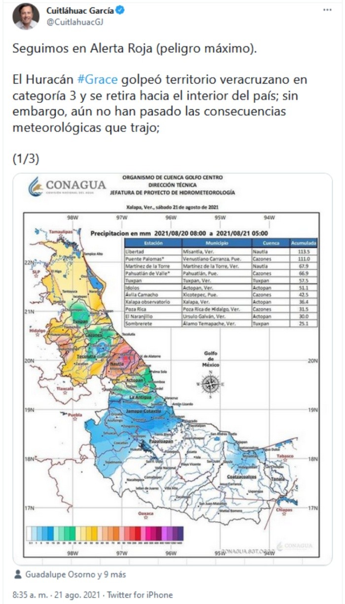 El huracán ''Grace'', de categoría 1 en la escala Saffir-Simpson y ya en tierra, provoca lluvias intensas en al menos 16 estados del centro de México, informó este sábado el Servicio Meteorológico Nacional (SMN).Los estados que resienten lluvias torrenciales son Colima, Guerrero, Michoacán, Puebla, San Luis Potosí y Veracruz; lluvias intensas Hidalgo, Jalisco, Oaxaca, Querétaro, Tamaulipas y Tlaxcala, y lluvias muy fuertes en Guanajuato y Morelos y fuertes el Estado de México y la Ciudad de México.En su reporte de las 07:00 horas, el SMN indicó que ''Grace'' continúa en tierra aproximadamente a 20 kilómetros (km) al sur-sureste de Tulancingo, Hidalgo, y a 100 km al este-noreste de la Ciudad de México.Registra vientos máximos sostenidos de 150 km/h, rachas de 170 km/h y se desplaza hacia el oeste-suroeste a 22 km/h.El ciclón tocó tierra como huracán categoría 3 a las 00:30 horas del sábado al norte del municipio de Tecolutla, Veracruz.El impacto y avance de ''Grace'', con intensas lluvias y vientos de hasta 190 kilómetros por hora, dejó cientos de viviendas dañadas en el estado de Veracruz y hasta ahora no se reportan víctimas mortales.Los efectos del fenómeno meteorológico se sintieron con mayor intensidad en el norte de Veracruz, en una región petrolera, rural e indígena, donde sus habitantes reportaron horas de zozobra y terror.En los municipios de Poza Rica, Tihuatlán, Cazones y la sierra de Papantla los reportes preliminares dan cuenta de cientos de viviendas dañadas, caída de árboles, bardas y anuncios espectaculares.Una amplia franja de poblaciones se encuentran sin energía eléctrica e incomunicados por el cierre de carreteras federales, estatales y locales; además se cortó la comunicación celular.La Comisión Nacional del Agua (Conagua) reportó que los ríos Cazones, Actopan y La Antigua, los de mayor afluencia en el norte del estado, rebasaron su escala crítica en algunas zonas, por lo que emitió una alerta general ante posibles desbordamientos.Las lluvias de más de 300 milímetros por metro cuadrado de las bandas nubosas de ''Grace'' afectan toda la región montañosa de Veracruz y la sierra norte del estado de Puebla, donde hay anegamientos e inundaciones en zonas urbanas y comunidades rurales.Las precipitaciones pluviales en la montaña están generando crecidas en los principales ríos que desembocan hacia el Golfo de México.El Ejército Mexicano se ha movilizado con su Plan DN-III de ayuda a la población y de manera conjunta con autoridades civiles realizan tareas de rescate en comunidades rurales y centros urbanos, sin que se tenga ahora número exacto de daños.Aunque autoridades locales reportaron que ''Grace'' se adentra al territorio central de México, al tiempo que pierde fuerza, pidieron a la población mantenerse alerta, ya que las lluvias podrían provocar deslaves, incremento en los niveles de ríos y arroyos.Además, podría haber desbordamientos e inundaciones en zonas bajas, por ello exhortaron a la población de los estados mencionados y a la navegación marítima a atender los avisos del SMN y seguir las indicaciones de las autoridades estatales, municipales y de Protección Civil.El gobernador de Veracruz, Cuitláhuac García Jiménez informó que se mantienen en Alerta Roja y advirtió que los efectos de ''Grace'' aun se resentirán en las próximas horas."Seguimos en Alerta Roja (peligro máximo). El Huracán 'Grace' golpeó territorio veracruzano en categoría 3 y se retira hacia el interior del país; sin embargo, aún no han pasado las consecuencias meteorológicas que trajo", dijo en un mensaje.El mandatario advirtió que la lluvia intensa y el viento remanente se estacionará por las próximas horas, por lo que llamó a la población de zonas inundables, en las ciudades, barrios, localidades y comunidades, a que busque los refugios más altos.Recomendó evitar cruzar ríos, no atravesar calles con torrentes de agua y evitar cruzar puentes sobre ríos caudalosos.En un comunicado difundido ayer por el Gobierno de México, la Conagua informó que para el domingo, los remanentes de ''Grace'' afecten los estados de Colima, Michoacán y Jalisco, y que muy probablemente den origen a un nuevo ciclón tropical en el Océano Pacífico, frente a las costas de esta Entidad.Sigue leyendo…Si te interesó esta noticia y quieres saber más, entonces descarga y descubre INFORMAPlus, la aplicación digital de EL INFORMADOR, en donde tenemos contenidos exclusivos, seleccionados por nuestros editores, para darles una experiencia más completa a los lectores.Descarga la aplicación y pruébala GRATIS por treinta días.Si eres suscriptor de EL INFORMADOR tu acceso está incluido, solicítalo al 33 3678-7777OF
