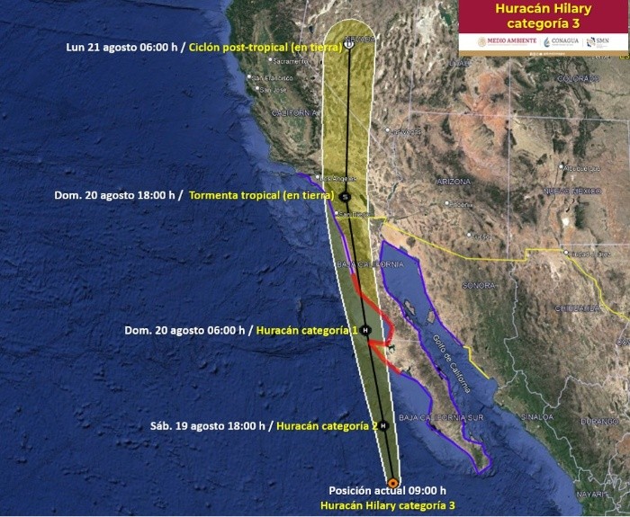 El huracán "Hilary" disminuyó su categoría a 3, en la escala Saffir-Simpson, según el aviso elaborado este sábado por el Servicio Meteorológico Nacional (SMN), fuente oficial del Gobierno de México en materia climática, aunque todavía es un fenómeno peligroso que pronto tocará tierra.De acuerdo a la información del SMN, el huracán "Hilary" y sus extensas bandas nubosas cubren la Península de Baja California y el noroeste del país, ocasionando lluvias muy fuertes a intensas, así como fuertes rachas de viento en dichas regiones y oleaje elevado en sus costas.En su distancia más cercana del país, el ciclón tropical se encuentra esta mañana a 375 km al oeste de Cabo San Lucas, Baja California Sur, y a 630 km al sur-sureste de Punta Eugenia, Baja California Sur.El SMN pronostica que "Hilary" mantenga como huracán categoría 3 hasta la tarde de este mismo sábado, para luego disminuir a 2. Ya el domingo, temprano por la mañana, bajaría a categoría 1 y se aproximaría a tocar tierra.Para el mismo domingo 20 de agosto, pero por la tarde, ya como tormenta tropical, "Hilary" tocaría tierra a la altura de Tijuana, Baja California y San Diego, California. El lunes 21 de agosto, ya se trataría de un ciclón post-tropical, pero continuaría en tierra, internándose más en el territorio de California en los Estados Unidos para, eventualmente, desaparecer.Lluvias puntuales intensas en Baja California, Baja California Sur, Sonora (costa) y Sinaloa (costa norte); lluvias puntuales muy fuertes en Nayarit, Jalisco, Zacatecas, Aguascalientes y Guanajuato; lluvias puntuales fuertes en Chihuahua y Durango.Se prevén rachas de viento de 120 a 150 km/h y oleaje de 8 a 10 metros de altura en las costa oeste de Baja California Sur; rachas de viento de 80 a 100 km/h y oleaje de 5 a 7 metros de altura en la costa este de Baja California Sur, costas este y oeste de Baja California, costa de Sinaloa y Sonora; además de rachas de viento de 40 a 60 km/h y oleaje de 2 a 4 metros de altura en costas de Nayarit y Jalisco.Con información del Servicio Meteorológico NacionalOA