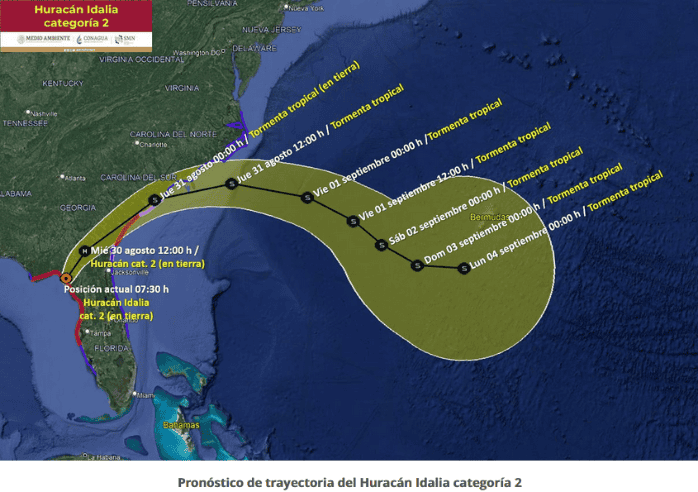 "Idalia", ahora como huracán de categoría 2 en la escala Saffir-Simpson, tocó tierra sobre Florida, Estados Unidos, lejos de costas nacionales, por lo que no representa peligro; de acuerdo al Servicio Meteorológico Nacional (SMN), fuente oficial del Gobierno de México en materia climática.El huracán "Idalia" está en tierra sobre Florida, a 30 km al sur-suroeste de Madison, Florida, EU, y a mil 050 km al nor-noreste de las costas de Quintana Roo. El desplazamiento actual del ciclón es hacia el nor-noreste (20°) a 30 km/h y mantiene vientos máximos sostenidos de 175 km/h y rachas de 215 km/h.Según el pronóstico elaborado por el SMN, "Idalia" mantendrá su categoría como huracán categoría 2 hasta mañana, cuando pierda fuerza y se degrada a tormenta tropical, cuando sigua en tierra sobre Carolina del Sur, y a mil 475 km al nor-noreste de Cabo Catoche, Quintana Roo.Con información Servicio Meteorológico NacionalOA
