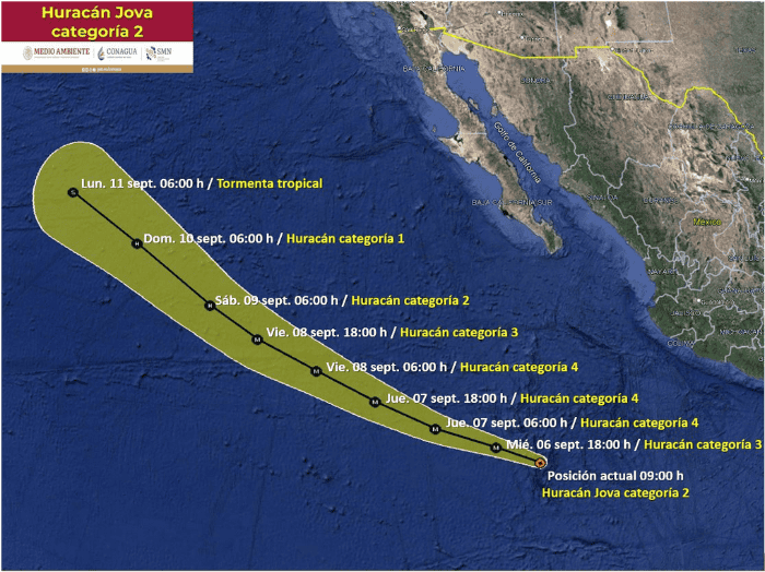El huracán "Jova" alcanzó la categoría 2 en la escala Saffir-Simpson la mañana de este miércoles 6 de septiembre, según informó el Servicio Meteorológico Nacional (SMN), fuente oficial del Gobierno de México en materia climática, pero seguirá evolucionando y se prevé que llegue al peligroso nivel 4.La circulación del huracán "Jova" refuerza la probabilidad de lluvias muy fuertes a intensas en el occidente y sur del país, originando rachas de viento y oleaje elevado en costas de Jalisco, Colima y Michoacán. El ciclón se encuentra a 835 km al suroeste de Playa Pérula, Jalisco, y a 970 km al sur de Cabo San Lucas, Baja California Sur. Sus desprendimientos nubosos refuerzan la probabilidad de lluvias muy fuertes a puntuales intensas en Jalisco, Colima, Michoacán y Guerrero (occidente). Además, se pronostica viento con rachas de 40 a 60 km/h y oleaje de 1 a 3 metros de altura en las costas de Jalisco, Colima y Michoacán.De acuerdo al pronóstico elaborado por el SMN, esta será la evolución del huracán "Jova":Las autoridades pidieron extremar precauciones a la población en general en las zonas de los estados mencionados por lluvias, viento y oleaje (incluyendo la navegación marítima) y atender las recomendaciones emitidas por las autoridades del Sistema Nacional de Protección Civil, en cada entidad.Con información del Servicio Meteorológico NacionalOA