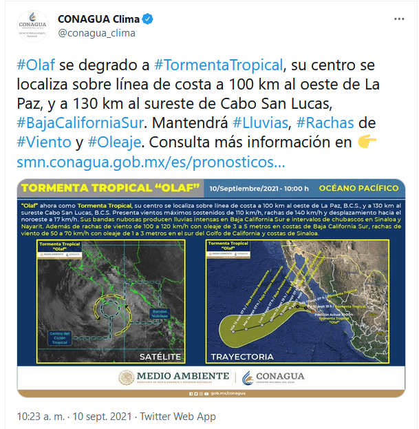 ''Olaf'' se degradó este viernes a tormenta tropical mientras se desplaza a lo largo de la península de Baja California, desatando fuertes precipitaciones y oleaje en México, informó el Centro Nacional de Huracanes (NHC) de Estados Unidos.Según el último reporte del NHC, el centro de ''Olaf'' se encontraba a 100 kilómetros de La Paz, registraba vientos sostenidos de 110 km/h y se desplazaba a 17 km/h.''Olaf'' tocó tierra la noche del jueves en el turístico municipio de Los Cabos como huracán categoría 2 en la escala Saffir-Simpson (de 5). Al salir el sol se debilitó a categoría 1 para finalmente convertirse en tormenta tropical por la mañana."El centro de 'Olaf' se desplazará a lo largo de la costa suroeste de Baja California y luego girará hacia el oeste alejándose de tierra por la noche", señala el pronóstico del NHC.Según la Comisión Nacional del Agua (Conagua) de México, el centro de ''Olaf'' volvió al Pacífico y se mantiene bordeando la costa afectando el noroeste del país.El fenómeno desata fuertes precipitaciones en los estados costeros de Baja California Sur, Sinaloa y Nayarit que "podrían generar deslaves, incremento en los niveles de ríos y arroyos, y desbordamientos e inundaciones en zonas bajas", advierte un comunicado de la Conagua.Hasta el momento las autoridades de Baja California no han reportado heridos, pero se mantienen cerrados dos puertos y las terminales aéreas de Los Cabos y La Paz, la capital estatal, además de que se han suspendido actividades públicas y privadas en esos municipios.Ante el riesgo de inundaciones se evacuó un hospital público de Los Cabos, uno de los destinos turísticos más visitados de México, reportó Protección Civil estatal.México ha sido golpeado por fenómenos meteorológicos en las últimas semanas que han provocado intensas lluvias en amplias zonas de su territorio.Fuertes precipitaciones inundaron el martes un hospital de Tula, en el céntrico estado de Hidalgo, provocando la muerte de 14 pacientes de COVID-19 que se quedaron sin ventilación mecánica.La tarde del jueves, autoridades de Baja California Sur habilitaron albergues para seis mil personas.Por su ubicación geográfica, México es susceptible al impacto de huracanes.A finales de agosto el huracán ''Nora'' tocó tierra en Jalisco, en el Pacífico mexicano y dejó un menor español fallecido y una mujer desaparecida.También en agosto, el huracán ''Grace'' impactó en Veracruz, en el este de México, como categoría 3 y provocó la muerte de al menos 11 personas en ese estado y en Puebla.Sigue leyendo…Si te interesó esta noticia y quieres saber más, entonces descarga y descubre INFORMAPlus, la aplicación digital de EL INFORMADOR, en donde tenemos contenidos exclusivos, seleccionados por nuestros editores, para darles una experiencia más completa a los lectores.Descarga la aplicación y pruébala GRATIS por treinta días.Si eres suscriptor de EL INFORMADOR tu acceso está incluido, solicítalo al 33 3678-7777OF