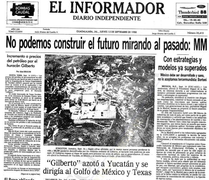 Esta madrugada, el huracán "Otis", de categoría 5, impactó en el puerto de Acapulco, Guerrero. El hecho recordó al poderoso huracán "Gilbert", también de categoría 5, que azotó las costas de la península de Yucatán en el año de 1988, un ciclón que ha sido catalogado como uno de los más destructivos en la historia de México.Fue el 14 de septiembre de 1988 cuando "Gilbert" azotó las costas de la península de Yucatán, cruzó el Golfo de México y su fuerza impactó en el noreste del país. Los fuertes vientos y el oleaje elevado de "Gilbert" dejaron destrucción en los estados de Quintana Roo y Yucatán, pero también el fenómeno cruzó el Golfo de México e impactó en Tamaulipas y Nuevo León, y finalmente se disipó en Coahuila.Según datos oficiales, el huracán "Gilbert" dejó 225 muertos y 51 mil 610 personas damnificadas; provocó la evacuación de 140 mil personas y provocó daños a la navegación, comunicaciones, servicios urbanos e infraestructura.El huracán dejó una pérdida económica por cerca de 76 millones de dólares.Los huracanes son fenómenos peligrosos, por lo que es importante estar preparados para enfrentarlos. Lo mejor es mantenerse informados sobre las condiciones del clima y seguir las instrucciones de las autoridades.Durante la mañanera de hoy en Palacio Nacional, el Presidente Andrés Manuel López Obrador informó que "pegó muy fuerte" el huracán "Otis" en la Costa Grande de Guerrero, y que hasta el momento no hay reporte de personas fallecidas, aunque tampoco hay comunicaciones.*Con información de SUN*Mantente al día con las noticias, únete a nuestro canal de WhatsAppOF