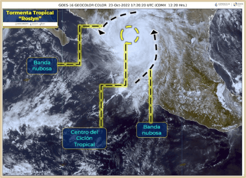 En el último reporte del Sistema Meteorológico Nacional de la Conagua se informó que el huracán "Roslyn", que hasta el medio día se había degradado a categoría 1, ya se desplaza sobre tierra como tormenta tropical. Hasta las 13:00 horas, "Roslyn" se localizó aproximadamente a 90 kilómetros (km) al sur-sureste de Durango, Durango, con vientos máximos sostenidos de 110 kilómetros por hora (km/h), rachas de 150 km/h y desplazamiento hacia el nor-noreste a 31 km/h.Durante las próximas horas, su nubosidad mantendrá condiciones para lluvias intensas en Durango, Nayarit y el sur de Sinaloa; muy fuertes en Jalisco y Zacatecas; fuertes en Aguascalientes y Colima; viento con rachas de 80 a 100 km/h en costas de Jalisco, Nayarit y Sinaloa, y rachas de 50 a 70 km/h en Aguascalientes, Durango, San Luis Potosí y Zacatecas.Dos personas fallecieron durante el paso del huracán "Roslyn" por Nayarit. Una de las víctimas fue identificada como Ana Rosa Moreno Pimentel, habitante del municipio de Rosamorada, quien quedó sepultada cuando su domicilio colapsó a causa de la fuerza del viento y el agua.En tanto, en la isla de Mexcaltitán, en el municipio de Santiago Ixcuintla, un hombre identificado como Gilberto Hernández Rodríguez, de aproximadamente 80 años, murió al caerle una barda.gc