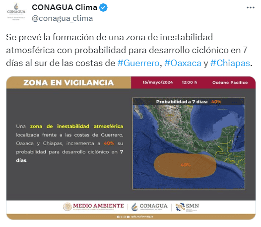 Este miércoles 15 de mayo inicia oficialmente la temporada de ciclones tropicales en el Pacífico, la cual concluye hasta el 30 de noviembre.El comienzo de la temporada de huracanes no significa que hoy comience a llover de manera formal, pues las precipitaciones pueden comenzar antes o después, según las condiciones de cada región. Sin embargo, de acuerdo con la más reciente actualización de la Comisión Nacional del Agua (Conagua), se prevé la formación de una zona de inestabilidad atmosférica con probabilidad para desarrollo ciclónico en 7 días al sur de las costas de Guerrero, Oaxaca y Chiapas.De acuerdo con el Servicio Meteorológico Nacional (SMN), la posible zona de inestabilidad se desarrollaría el sureste del Pacífico mexicano, y ya aumentó a 40% su probabilidad de desarrollo ciclónico en los próximos 7 días.De acuerdo con el Centro Nacional de Huracanes de Estados Unidos (NHC, por sus siglas en inglés), la zona de inestabilidad se formaría a cientos de kilómetros al sur del Golfo de Tehuantepec y a partir de que aparezca, se vigilará un posible desarrollo gradual a depresión tropical mientras se mueva por el océano durante el fin de semana y hasta comienzos de la próxima.El NHC señala que en promedio se forman 15 tormentas con nombre, 8 huracanes, 4 de estos de categoría mayor durante cada temporada en el océano Pacífico.Si quieres conocer más sobre lo que se espera para la temporada de lluvias 2024, lee: Estos son los estados con mayor riesgo de impacto de huracán*Mantente al día con las noticias, únete a nuestro canal de WhatsAppOF