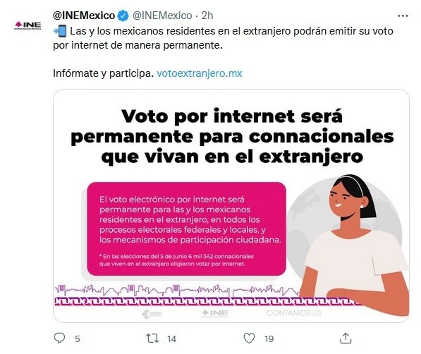 El Instituto Nacional Electoral (INE) realizó la apertura del Sistema de Voto Electrónico por Internet (SIVEI) para las mexicanas y los mexicanos residentes en el extranjero en el marco de los Procesos Electorales Locales 2021-2022.Lo anterior, para las elecciones de gubernatura de Aguascalientes, Durango, Oaxaca y Tamaulipas que contemplan el voto extraterritorial en su legislación.En total, seis mil 343 ciudadanas y ciudadanos residentes en el exterior podrán emitir su voto, si así lo desean, a partir de las 20:00 horas del día de hoy y hasta las 18:00 horas (tiempo de la Ciudad de México) del próximo 5 de junio.Distribución de la Lista Nominal La distribución de la Lista Nominal de Electores Residentes en el Extranjero (LNERE) bajo la modalidad electrónica por entidad es la siguiente: Aguascalientes con sólo 678 ciudadanos inscritos; Durango con mil 389; Oaxaca dos mil 520; y Tamaulipas con mil 756.Desde la biblioteca de la Junta Local Ejecutiva de Aguascalientes, se llevó a cabo la configuración de cada una de las cuatro elecciones, en la que se verificaron los datos generales, las boletas electorales electrónicas y el idioma.A continuación, se realizó el protocolo de creación de la llave criptográfica -la cual se utilizará en la apertura de la urna electrónica con los votos recibidos hasta el 5 de junio- y de la bóveda de resguardo. Se generaron dos copias de esta llave criptográfica para resguardo de las personas custodias y de la Oficialía Electoral del INE.Finalmente, se hizo la publicación de cada elección, se generaron las actas de inicio del periodo de votación (firmadas de manera autógrafa) y se efectuó la apertura del SIVEI con lo que quedó listo para recibir los sufragios de las mexicanas y los mexicanos que viven en el exterior, a partir de las 20:00 horas.JM