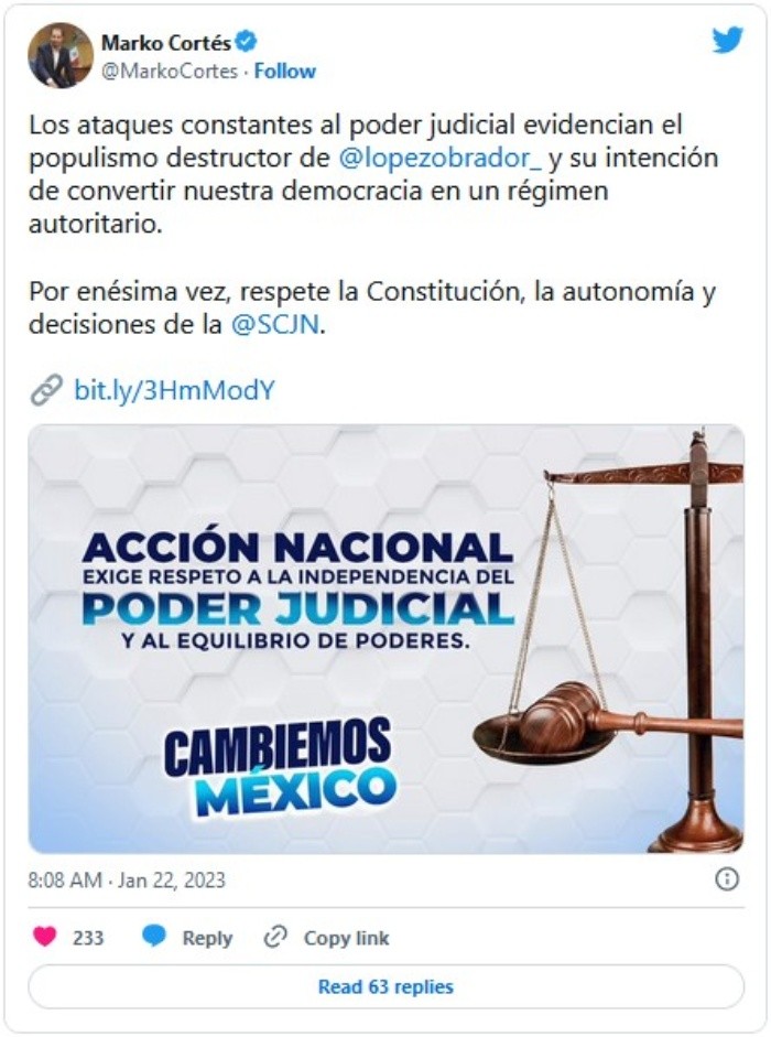 En defensa del Instituto Nacional Electoral (INE) y la democracia, este lunes el dirigente nacional del Partido Acción Nacional (PAN), Marko Cortés Mendoza, presentará ante la Suprema Corte de Justicia de la Nación (SCJN), una acción de inconstitucionalidad contra reformas electorales del Plan B impulsadas por el gobierno del Presidente Andrés Manuel López Obrador."Atacar al Poder Judicial, como lo hace López Obrador, pone de manifiesto que el populismo destructor busca convertirse en un régimen autoritario", afirmó el dirigente panista, quien exigió por enésima vez a López Obrador que respete la Constitución, la autonomía y las decisiones de la SCJN.Además, denunció que "los ataques de López Obrador contra la nueva presidenta de la SCJN demuestran su talante misógino y autoritario, su afán por acabar con la separación de poderes y con la democracia, justamente como ha ocurrido en Cuba, Nicaragua, Venezuela o Corea del Norte".Cortés Mendoza subrayó que Acción Nacional expresa su total respeto y respaldo a la ministra presidenta de la Corte, Norma Lucía Piña Hernández, y por medio de ella a todo el Poder Judicial, "injustamente acosado y acusado por López Obrador, quien, como siempre, ataca sin pruebas, solamente porque intenta someter y desprestigiar a los jueces".En este sentido, exhortó a la ciudadanía a mantenerse atenta frente a la constante violación de la Constitución y la ley por parte del Poder Ejecutivo. "Hasta el momento, los especialistas han documentado 182 acciones presuntamente ilegales" cometidas por el gobierno y su partido, en la más absoluta de las impunidades.Una de esas acciones ilegales, agregó, es el Plan B electoral del Presidente López Obrador y su partido en contra de la democracia mediante el desmantelamiento del INE.Marko Cortés advirtió que el PAN no dejará pasar este nuevo atentado contra la democracia, por lo que presentará este lunes, en su calidad de presidente del Comité Ejecutivo Nacional del partido, una acción de inconstitucionalidad ante la SCJN contra las reformas electorales del plan B ya aprobadas, y al mismo tiempo, se preparará para controvertir las reformas que Morena y sus aliados ya se disponen a aprobar en contra de la Constitución.El líder panista dijo que presentar esta acción de inconstitucionalidad es una responsabilidad patriótica del partido y una exigencia de la sociedad civil, con cuyos diversos representantes en las 32 entidades federativas ha sostenido encuentros en las últimas semanas, para refrendarles este compromiso firme y decidido en defensa de nuestra democracia.JM