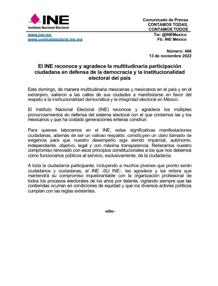 Tras las marchas de este domingo en distintas ciudades del país, el Instituto Nacional Electoral (INE) reconoció y agradeció "los múltiples pronunciamientos en defensa del sistema electoral con el que contamos las y los mexicanos y que ha costado generaciones enteras construir". En un comunicado señaló que: "Para quienes laboramos en el INE, estas significativas manifestaciones ciudadanas, además de ser un valioso respaldo, constituyen un claro llamado de exigencia para que nuestro desempeño siga siendo imparcial, autónomo, independiente, objetivo, legal y con máxima transparencia".El INE reiteró su "compromiso renovado" con esos principios constitucionales a los que se deben sus integrantes, "como funcionarios públicos al servicio, exclusivamente, de la ciudadanía".El organismo electoral subrayó que mantendrá su "compromiso inquebrantable con la organización profesional de todos los procesos electorales de los años por delante, vigilando siempre que las contiendas ocurran en condiciones de equidad y que los diversos actores políticos cumplan con las reglas existentes".Destacó que de manera multitudinaria, mexicanas y mexicanos en el país y en el extranjero salieron a las calles de sus ciudades a manifestarse en favor del respeto a la institucionalidad democrática y la integridad electoral en México.