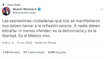 El líder de Morena en el Senado, Ricardo Monreal Ávila, dijo que tras la marcha convocada en distintivas ciudades del país en contra de la reforma electoral deben tomarse en cuenta las voces de la ciudadanía."Las expresiones ciudadanas que hoy se manifestaron nos deben llamar a la reflexión serena. A nadie deben extrañar ni menos ofender; es la democracia y es la libertad. Es el México vivo", compartió en sus redes sociales. Por otra parte, el líder del PAN en la Cámara de Senadores, Julen Rementería del Puerto, dijo que asistió a la marcha en repudio de la reforma electoral."Para dejarle bien claro a Morena y al Gobierno Fallido de la 4T que en México los ciudadanos elegimos mantener nuestra democracia y nuestra libertad, y que desde las calles, Cámara de Diputados y el Senado les haremos frente: #ElINENoSeToca”. "Nuestra democracia, es la defensa de tu voto y que nadie se agencie, sea dueño de los procesos electorales"."Celebro la manifestación pacífica que miles de mujeres y hombres hicieron posible este domingo, en diferentes ciudades del país, para defender nuestra democracia. El Presidente, Morena y sus aliados no pueden ignorar las expresiones que exigen que se respete la autonomía del INE. Dejemos atrás la confrontación y elevemos el debate"."El día de hoy fuimos testigos más que de una marcha, de un movimiento en defensa de la Democracia, desde la ciudadanía, en más de 50 ciudades en México, EUA y España. #YoDefiendoAlINE"."La marcha por la supuesta defensa del INE no es más que la defensa a una cúpula electoral encabezada por algunos consejeros adictos a los lujos y privilegios".