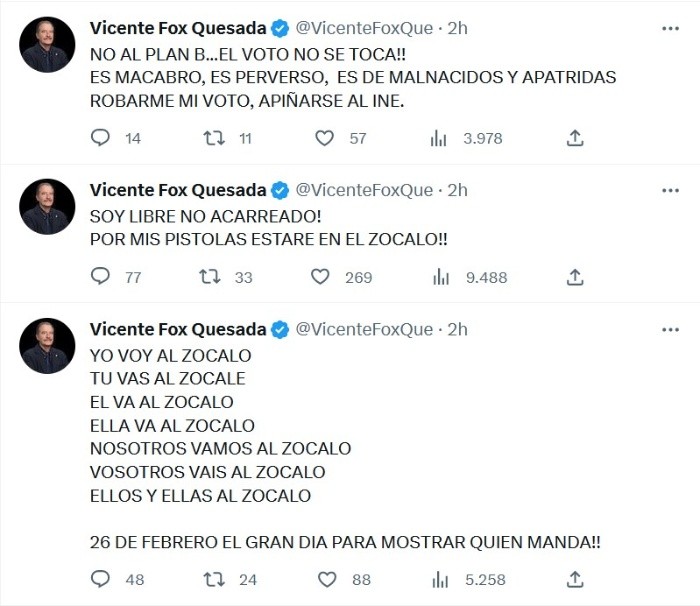 El expresidente de México, Vicente Fox, hizo un llamado "por sus pistolas" a marchar el próximo 26 de febrero rumbo al Zócalo de la Ciudad de México, en defensa del Instituto Nacional Electoral (INE) y "para demostrar quién manda".Ante el Plan B de la reforma electoral impulsado por el Presidente Andrés Manuel López Obrador, el exmandatario de México usó sus redes sociales para no "apiñarse al INE"."Que nadie se me raje", expresó Fox en otro mensaje al hacer un llamado a defender el voto, la libertad y la democracia."A la Alameda por una concha con nata. Al Zócalo por el INE", expresó Vicente Fox, quien calificó de "macabro", "perverso", "de mal nacidos" y "apátridas" el Plan B de la reforma electoral."Soy libre, no acarreado. Por mis pistolas estaré en el Zócalo", agregó el exmandatario panista.JM