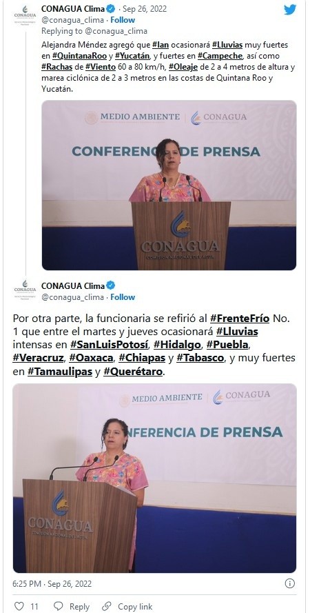 La tarde de este lunes, el huracán "Ian" se intensificó a categoría 2, con afectaciones previstas en los estados de Yucatán, Quintana Roo y Campeche, pronosticó este lunes el Servicio Meteorológico Nacional (SMN)."La distancia entre Cuba y México es aproximadamente de 220 kilómetros, entonces, las bandas nubosas occidentales del huracán van afectar a Quintana Roo y Yucatán", dijo en conferencia de prensa la coordinadora del SMN, Alejandra Méndez Girón.En esos dos estados se esperan lluvias puntuales muy fuertes, mientras que en Campeche se esperan lluvias fuertes, con precipitaciones de 75 a 100 milímetros (mm).Además, se espera oleaje de dos a cuatro metros de altura y vientos de 60 a 80 kilómetros y marea ciclónica.Méndez Girón destacó que en los últimos días "ha estado lloviendo mucho sobre la Península de Yucatán -integrada por los estados de Yucatán, Quintana Roo y Campeche- y debido a ello los suelos están saturados y es factible que se den las inundaciones en la región".Según el Centro Nacional de Huracanes estadounidense (NHC), a las 21:00 hora local los vientos del huracán "Ian" aumentaron rápidamente de 135 kilómetros por hora (km/h) a 155 km/h, lo que lo convirtió en huracán de categoría 2 en la escala Saffir-Simpson, mientras se acercaba al occidente de Cuba.El reporte indicó que el centro del sistema fue hallado a 250 kilómetros (km) al suroeste del extremo más occidental de Cuba y a 380 km al este de Cozumel, Quintana Roo.JM