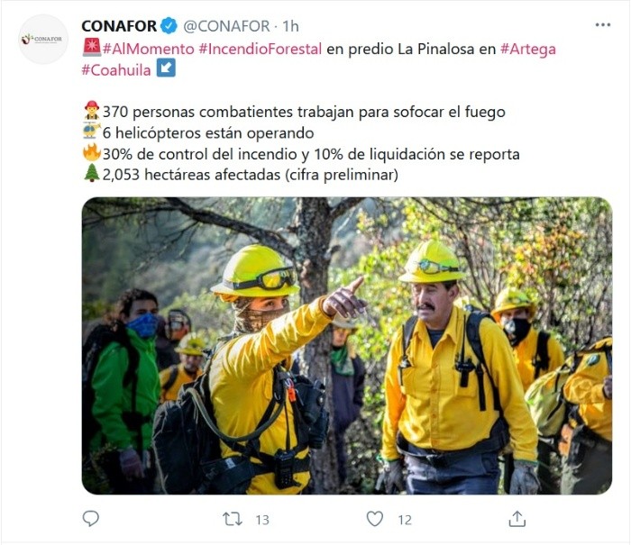 La Comisión Nacional Forestal (Conafor) informó que los incendios de "La Pinalosa", en el municipio de Arteaga, Coahuila; y "Ejido San José Boquillas", en el municipio de Santiago, Nuevo León, reportan un control de 30% y 40%, respectivamente. Lo anterior al considerarse de especial atención al presentar afectaciones a viviendas.Detallan que, para el combate a las llamas, en "La Pinalosa", operarán cuatro helicópteros del Gobierno del Estado con matrículas N63-GC, XC-GEC, XB-DBQ, N218-MH, los cuales realizarán traslado de personal y descargas, así como dos helicópteros MI-17 pertenecientes a la Guardia Nacional con matrículas GN201 y GN204, los cuales realizarán descargas."En el incendio 'Ejido San José de Boquillas', municipio de Santiago, también en el estado de Nuevo León, se encuentran disponibles siete equipos aéreos; el perteneciente al Gobierno del Estado y uno del convenio Sedena-Conafor, realizan descargas", precisó la Conafor.Otro de los incendios que ya se encuentra con avance de liquidación considerable es el de "P.P. El Envolvente", con un 85% de control, en el municipio de Galeana, Nuevo León, en donde operó un helicóptero de Gobierno del Estado con matrícula XC-GNL, el cual realiza monitoreo y evaluación; en el "Ejido San Francisco Javier" operaron dos helicópteros del Gobierno del Estado con matrículas; XB-OUV, los cuales realizan descargas.La Conafor también informó sobre la situación de incendios forestales en el país y detalló que hasta el momento hay 39 activos distribuidos en 12 estados del país, con una superficie afectada de nueve mil 365 hectáreas."Asimismo, se tiene un total de 13 incendios liquidados; es decir, ya no representan un riesgo de propagación del fuego. Para su atención se encuentran trabajando un total de mil 954 personas combatientes, entre personal de la Conafor y otras instancias", precisan.JM