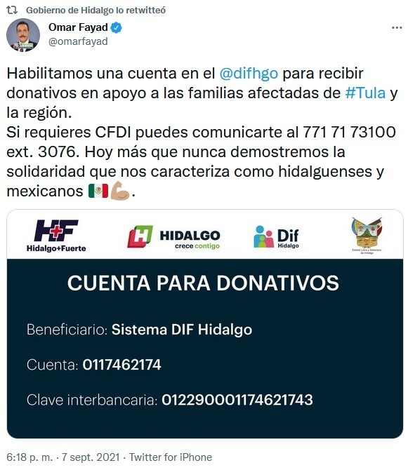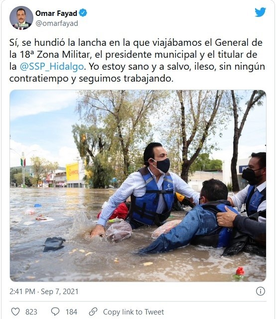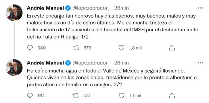 El Presidente Andrés Manuel López Obrador (AMLO) lamentó la tarde de este martes la muerte de 17 pacientes del hospital del IMSS en Tula, Hidalgo, derivado de las inundaciones tras las fuertes lluvias registradas en la madrugada.A través de su cuenta de Twitter, AMLO calificó el día de hoy como "malo" debido a la tragedia en Hidalgo. “En este encargo tan honroso hay días buenos, muy buenos, malos y muy malos; hoy es un día de estos últimos. Me da mucha tristeza el fallecimiento de 17 pacientes del hospital del IMSS por el desbordamiento del río Tula”, se lee en uno de los tuits.En otro mensaje, AMLO seguró que en el Valle de México ha caído mucha agua y continuará la lluvia, por lo que hizo un llamado a las personas que viven en zonas bajas a trasladarse a albergues o partes altas.Las fuertes lluvias provocaron el desbordamiento de los ríos Salado, Tula y Rosas, en la zona de Tula.Se hunde lancha de Omar Fayad durante recorridoEl gobernador de Hidalgo, Omar Fayad, informó que la lancha en la que se trasladaba para apoyar "las acciones de emergencia" en el hospital del IMSS en Tula se hundió."Estoy sano y salvo, ileso, sin ningún contratiempo y seguimos trabajando", escribió el mandatario en su cuenta de Twitter acompañado de una fotografía donde se ve que lo están ayudando luego del hundimiento.Fayad Meneses señaló que en la embarcación viajaban él, el general de la 18 Zona Militar, el presidente municipal y el titular de la Secretaría de Seguridad Pública del Estado.El gobernador se trasladó a Tula para apoyar las acciones en el hospital del IMSS que resultó afectado por las inundaciones y donde continúan las labores para la reubicación de pacientes.Con información de El UniversalSi te interesó esta noticia y quieres saber más, entonces descarga y descubre INFORMAPlus, la aplicación digital de EL INFORMADOR, en donde tenemos contenidos exclusivos, seleccionados por nuestros editores, para darles una experiencia más completa a los lectores. Si eres suscriptor de EL INFORMADOR tu acceso está incluido, solicítalo al 33 3678-7777.Descarga la aplicación y pruébala GRATIS por treinta días.Para iOS: https://apple.co/35jaVgbPara Android: https://bit.ly/3gwVSEVJM