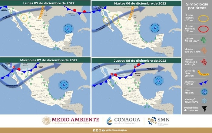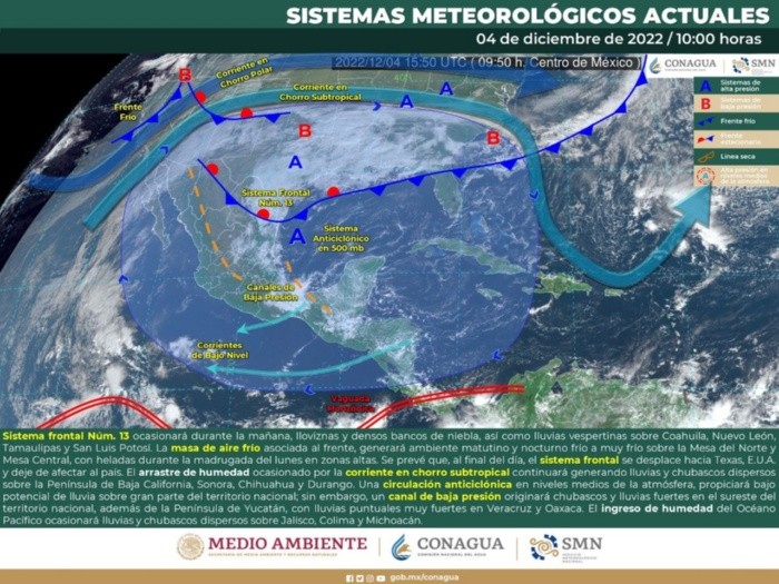 En las últimas horas se han registrado bajas temperaturas en algunos estados de la República Mexicana, debido a la entrada del frente frío 13, ¿pero qué estados se verán más afectados por este cambio de clima?Este domingo habrá lluvias en el noreste de México; su masa de aire frío originará ambiente nocturno frío a muy frío.El frente frío 13 se extiende con características de estacionario sobre el norte y noreste del país y ocasiona lloviznas y densos bancos de niebla. La masa de aire frío asociada al frente, generará ambiente matutino y nocturno frío a muy frío sobre la Mesa del Norte y Mesa Central, con heladas durante la madrugada del lunes en sus zonas altas. La proximidad de un nuevo frente frío en Baja California en interacción con el arrastre de humedad generado por las corrientes en chorro subtropical y polar, generarán lluvias puntuales fuertes en los siguientes estados: Sonora y Chihuahua, así como lluvias y chubascos en la Península de Baja California, Durango y Sinaloa.El marte, el nuevo frente frío asociado con una vaguada polar ingresará al noroeste del territorio nacional, en interacción con el arrastre de humedad generado por las corrientes en chorro subtropical y polar, ocasionarán un marcado descenso de temperatura, así como chubascos y lluvias fuertes en la Península de Baja California, Sonora, Chihuahua, Durango y Sinaloa.A partir de la noche del martes, se prevé caída de nieve o aguanieve sobre las sierras de Baja California, condición que se extenderá durante el día miércoles hacia las sierras de Sonora, Chihuahua y Durango. El frente frío se forma cuando una masa de aire frío choca con una masa de aire caliente, pues al ser más denso, el aire frío se mete como una cuña debajo del aire caliente, lo que genera movimiento y provoca inestabilidad en la atmósfera de esa zona.