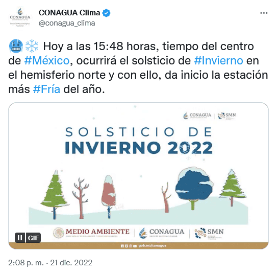 En estos días se han sentido temperaturas más bajas de lo acostumbrado, y esto tiene que ver con el ingreso del frente frío 18 que afecta a México, junto con un evento Norte. Ante esto, además de la cercanía con las fiestas de Navidad, usuarios en redes sociales se preguntan, ¿cuándo inicia el solsticio de invierno 2022 en México?De acuerdo con el Servicio Meteorológico Nacional (SMN), el solsticio de Invierno 2022 en el hemisferio norte inicia hoy miércoles 21 de diciembre a las 15:48 horas tiempo del centro de México.El invierno 2022 tendrá una duración de 88 días y 23 horas, y acabará cuando inicie la primavera el día 20 de marzo de 2023.Por otro lado, en el hemisferio sur dará inicio el solsticio de verano, con clima contrario al que se tendrá en el otro lado del mundo.Durante el invierno, en el cielo matutino podrán verse los planetas Marte, Júpiter y Saturno, en las tardes podrá verse Urano, mientras que Venus podrá ser visible a mediados de febrero.Según el portal "Live Science", el invierno es la temporada más fría del año. Aunque esta época del año está relacionada con temperaturas bajas y clima gélido, el clima depende de factores como la ubicación geográfica, por lo tanto, entre más lejos se encuentre un país del ecuador, más frías serán las temperaturas durante la estación, debido a que ciertas áreas reciben menos luz natural, y los días son más cortos que en el resto del año.La llegada de frentes fríos al país contribuye a periodos de bajas temperaturas, nevadas, heladas y evento de "Nortes" intensos sobre las regiones norte y noreste del territorio nacional, Golfo de México y Mar Caribe.También precipitaciones ligeramente arriba de lo normal en los estados del sureste y centro del país, además de condiciones secas y valores de temperaturas normales para la región noroccidental del territorio nacional aunque no se descartan nevadas sobre la región montañosa de citada región.Según los expertos, los países que experimentan los climas más fríos son: Kazajistán, Rusia, Groenlandia, Canadá, Estados Unidos, Islandia, Finlandia, Estonia y Mongolia. La Antártida es la región más fría del mundo.En invierno también son muy comunes las enfermedades respiratorias, por lo que es importante cuidar muy bien la salud. Estas son algunas recomendaciones para protegerte del frío:OF