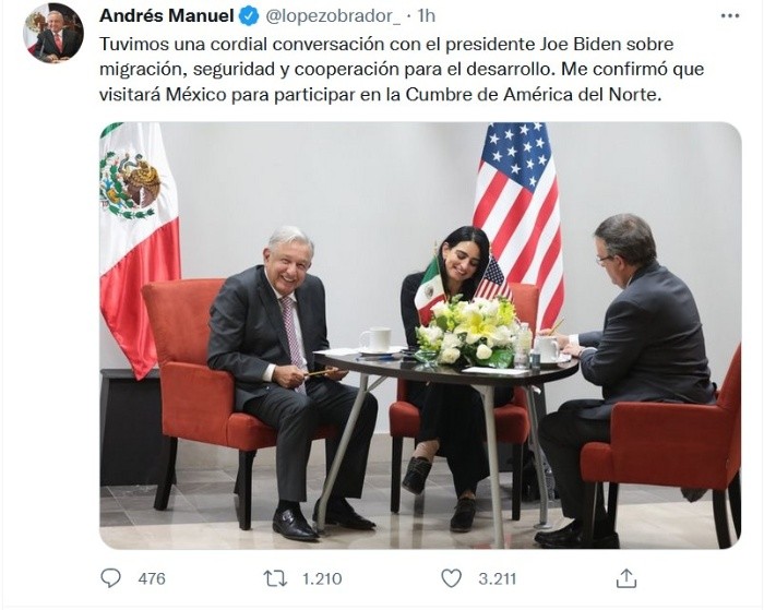 El presidente de Estados Unidos, Joe Biden, asistirá a la Cumbre de Líderes de América del Norte que se llevará a cabo en México en diciembre próximo, informó el Presidente Andrés Manuel López Obrador.La tarde de este martes, López Obrador y Biden sostuvieron una conversación telefónica donde abordaron temas de la agenda bilateral.El Presidente López Obrador se encuentra en Ciudad Victoria, Tamaulipas, donde encabeza la presentación del Plan de Apoyo para esa Entidad. "Tuvimos una cordial conversación con el presidente Joe Biden sobre migración, seguridad y cooperación para el desarrollo. Me confirmó que visitará México para participar en la Cumbre de América del Norte", dijo López Obrador por medio de un mensaje que difundió a través de sus redes sociales.JM