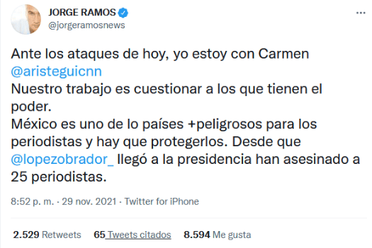 Jorge Ramos salió en defensa de su colega, Carmen Aristegui, luego de que el Presidente de México, Andrés Manuel López Obrador (AMLO) declarara que la periodista y la revista Proceso nunca han hecho un periodismo en favor del pueblo.A través de sus redes sociales, Jorge Ramos declaró que el trabajo del periodista es cuestionar a los que tienen poder y agregó que México es uno de los países más peligrosos para los periodistas y "hay que protegerlos"."Ante los ataques de hoy, yo estoy con Carmen", expresó el también presentador de noticias de Univisón.Luego de que "Proceso" y el portal "Aristegui Noticias" publicaron el reportaje "Sembrando Vida y la fábrica de chocolates", que plantea que el programa insignia del Gobierno tiene un particular impulso en Tabasco y beneficiaría a los hijos de AMLO y a su fábrica de chocolates "Rocío", el Presidente de México dijo durante la "mañanera" de ayer lunes que lo publicado por la revista y por Carmen Aristegui "no es cierto"."No tenemos identificación, no hay simpatías. Carmen Aristegui, pues escribe en Reforma y pues pertenece al grupo que apoya al bloque conservador. Entonces nada más aclararlo porque ya no estamos en los tiempos de la simulación (...) Pero era una especie de paladina de la libertad y yo tengo otra opinión porque cuando nosotros estábamos en la oposición, me entrevistaba una vez cada seis meses y buscaba ponerme en entredicho como buena periodista conservadora", declaró López Obrador.Al respecto, Carmen Aristegui proyectó en su noticiario el reportaje que publicó en colaboración con Proceso y envió una respuesta a López Obrador: "En Aristegui Noticias no estamos ni a favor ni en contra de su movimiento. Este espacio es, simple y sencillamente, eso, un espacio de periodistas"."Y yo le mandaría un último mensaje al Presidente López Obrador: usted sabe que lo estimo, estimo su larga batalla por llegar a la Presidencia de la República, pero ¡sereno, moreno! Lea el reportaje y ya luego platicamos. Y dígame usted si hay algo o no de qué preocuparse de la actividad empresarial de sus hijos", agregó la periodista.GC
