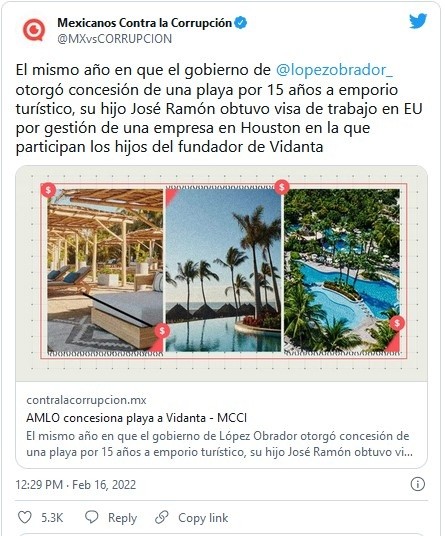 Una investigación de Mexicanos Contra la Corrupción y la Impunidad (MCCI) reveló este miércoles más vínculos entre un empresario afín al gobierno del Presidente Andrés Manuel López Obrador (AMLO) y su hijo mayor, José Ramón López Beltrán, criticado por llevar una lujosa vida en Estados Unidos.Grupo Vidanta, consorcio turístico fundado por Daniel Chávez, empresario, amigo y asesor de AMLO, recibió en 2020 la ampliación por 15 años de una concesión para ocupar una playa, así como un permiso para construir un teleférico sobre el río Ameca, que conectará dos megaproyectos turísticos en los estados de Jalisco y Nayarit, indicó la investigación de MCCI.Esta concesión y el permiso que recibieron fueron "otorgados el mismo año en que el hijo de López Obrador obtuvo la visa para trabajar en Estados Unidos por gestión e invitación de KEI Partners", apuntó el texto.KEI Partners, continuó la investigación, es una empresa inmobiliaria fundada en Houston por los hijos del fundador de Vidanta, "quienes también han tenido participaciones accionarias en compañías de ese consorcio turístico".Además, en junio del mismo año, Chávez fue nombrado por AMLO como su representante en la supervisión del tramo del Tren Maya que atraviesa la Riviera Maya, en donde Vidanta también tiene un conjunto de hoteles "que serán beneficiados con la obra ferroviaria".KEI Partners fue fundada en octubre de 2018 en Houston, dos meses antes de que López Obrador ocupara la presidencia.Según destacó MCCI, la concesión original había sido otorgada en 2005, durante el Gobierno de Vicente Fox (2000-2006), y vencía en mayo de 2020.La prórroga autorizada por Rodrigo Hernández Aguilar, director de Zona Federal Marítimo Terreste, permitirá que Vidanta utilice la playa hasta el año 2035, si bien en años anteriores ya se había modificado el título de concesión.Además, las empresas RGL Arrendadora de Inmuebles S.A. de C.V y Desarrollo Marina Vallarta, que forman parte del mega consorcio hotelero Vidanta, están a cargo de la construcción del teleférico que servirá como vía de comunicación entre dos complejos hoteleros localizados en Bahía de Banderas y Puerto Vallarta.En este contexto, y pese a que todavía no había una "opinión técnica" de los municipios cercanos a la obra, se aprobó el informe de impacto ambiental (MIA) necesario para la obra del teleférico."En 2020, año en que José Ramón López Beltrán comenzó a trabajar para los hijos del fundador de Vidanta, ese consorcio turístico obtuvo al menos 35 permisos o concesiones federales", destacó la ONG, muy crítica con el Gobierno actual, e indicó que también se otorgaron otros permisos en Los Cabos, otra zona turística de México.El escándalo rodea al hijo mayor de AMLO desde hace dos semanas, cuando MCCI y el medio Latinus, del periodista Carlos Loret de Mola, revelaron que el hijo del Mandatario vivió en 2019 en Houston, Texas, en la casa de un ejecutivo de Baker Hughes, que ese año amplió un contrato de Petróleos Mexicanos (Pemex).Tanto AMLO como Pemex negaron cualquier vínculo entre la compañía estatal y el hijo. "Ni con ninguna empresa vinculada al Gobierno, el asunto no es de conflicto de intereses", aseguró el Mandatario.JM