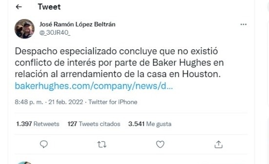 La empresa estadounidense Baker Hughes determinó que, tras revisar los contratos que tiene con Pemex, no encontró “ningún conflicto de interés” en el arrendamiento de la mansión donde vivió José Ramón López Beltrán, hijo del Presidente Andrés Manuel López Obrador (AMLO).El director de Baker Hughes para México y Latinoamérica, Bob Pérez, aseguró que en la auditoría hecha por el despacho McConnell Group, se concluyó que la renta de la casa lujosa en Houston, Texas, es una transacción particular entre Keith L. Schilling, un ex funcionario de la empresa, y Carolyn Adams, nuera de AMLO.En conferencia de prensa en las instalaciones de Petróleos Mexicanos y acompañado del director de la petrolera, Octavio Romero Oropeza, dijo que los papeles fueron firmados respetando las leyes mexicanas.Aseguró que Keith Schilling fue empleado de la firma Baker Hughes, pero salió de la empresa en diciembre de 2019.José Ramón López Beltrán, hijo de AMLO, escribió en sus redes sociales: "Despacho especializado concluye que no existió conflicto de interés por parte de Baker Hughes en relación al arrendamiento de la casa en Houston". También difundió el siguiente mensaje de Jenaro Villamil, presidente del Sistema Público de Radiodifusión del Estado Mexicano (SPREM): "Se les cayó el presunto caso de Conflicto De Interés en el caso de la casa de Houston. El vicepresidente para AL de Baker Hughes, Bob Pérez, señaló que tras la auditoría interna “no encontramos ningún conflicto de interés, nada irregular".Por su parte, el periodista Carlos Loret de Mola, quien dio a conocer la investigación de los lujos del hijo del Presidente, escribió en su Twitter:"Caso José Ramón: desde las oficinas de un sospechoso, el otro sospechoso asegura que su propia investigación los exonera… Esto cada día se pone mejor".El hijo del Presidente ya había hablado antes para intentar aclarar el reportaje donde se dan a conocer los lujos con los que vive.