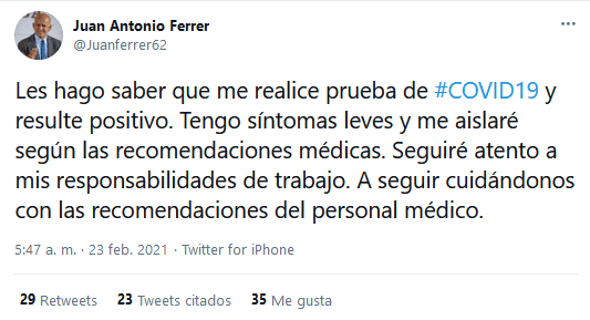 Juan Antonio Ferrer, titular del Instituto de Salud para el Bienestar (Insabi), dio positivo a COVID-19, según informó a través de redes sociales."Les hago saber que me realice prueba de #COVID19 y resulte positivo (sic)", indicó el funcionario.Ferrer dijo que tiene "síntomas leves", por lo que se aislará según las recomendaciones médicas", pero que seguirá atento a sus responsabilidades de trabajo, y pidió a la gente "seguir cuidándonos con las recomendaciones del personal médico".Apenas hace unos días, Hugo López-Gatell, subsecretario de Salud, informó que dio positivo a COVID-19.Esta mañana, el secretario de Marina, Almirante José Rafael Ojeda Durán, informó que volvió a dar positivo a su prueba de coronavirus."Les comparto que a partir de hoy estaré trabajando en aislamiento desde casa, tras haber dado positivo a la prueba de COVID-19".GC